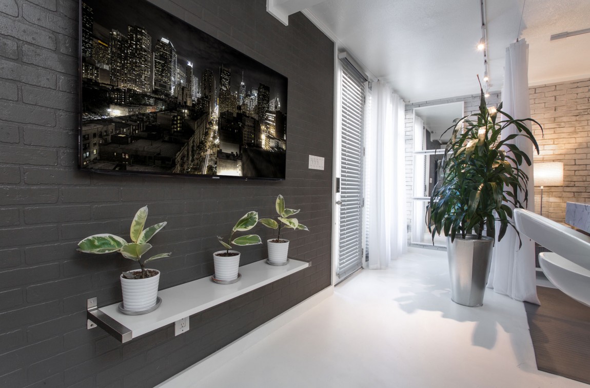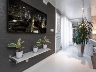 Par exemple, rien de mieux que de placer un téléviseur et une chaîne stéréo sur l’arrière-plan d’un mur de briques sombres: cette solution a toujours l’air très élégant et vous permet de faire une mise au point lumineuse sur la zone vidéo.