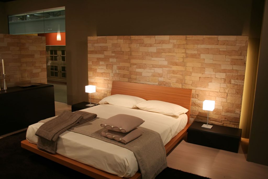 La chambre à coucher est universelle pour l'utilisation de carreaux de tous les matériaux, bien que les experts recommandent de privilégier le plâtre. La meilleure solution est de faire face au mur central de la pièce.situé derrière la tête de lit à la tête du lit. Le plus préféré sera une couleur beige neutre, qui donne toujours une légèreté particulière à la pièce, décorée dans cette palette de couleurs.Les couleurs vives sont toujours hors de propos dans la chambre à coucher, car c'est un endroit pour se détendre et dormir.