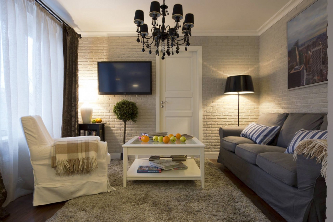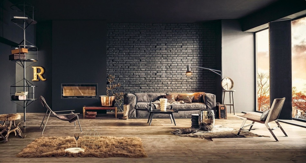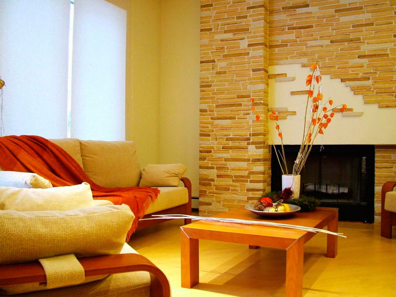 Tel tapis épais et moelleux sur le sol, un canapé et des chaises avec des oreillers moelleux peuvent devenir des éléments confortables. En conséquence, si la tuile est suffisamment sombre, il est préférable de choisir les meubles et les accessoires associés dans des tons plus clairs. Au contraire, les meubles plus sombres sont mieux combinés avec des carreaux clairs sous la brique.