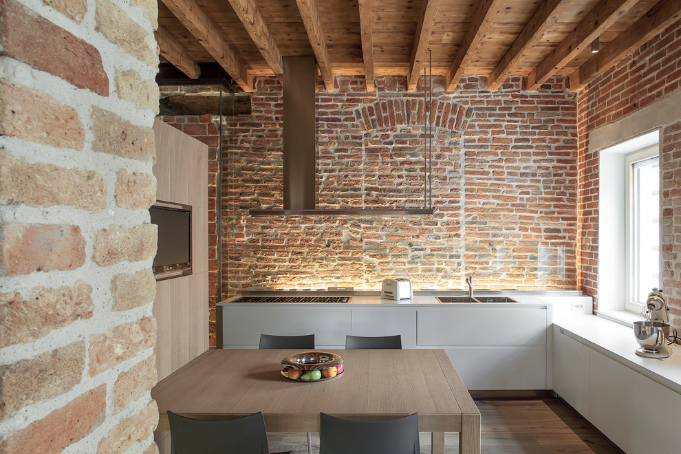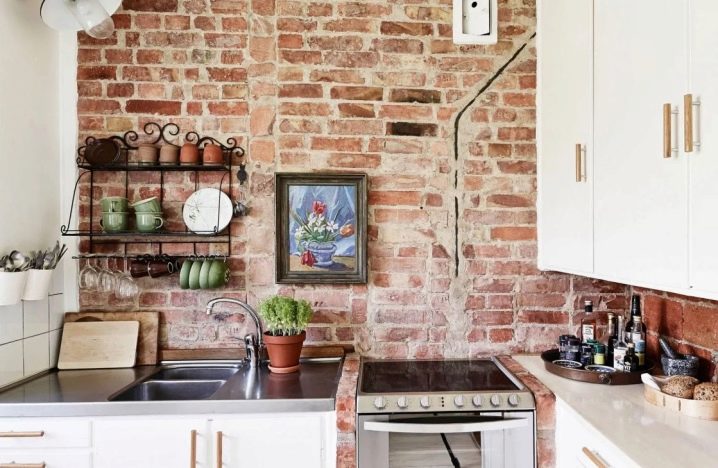 Si les locataires souhaitent ardemment décorer le revêtement intérieur des murs de leur maison sous une brique, ils ne seront pas obligés de recourir à un carrelage décoratif. Après tout, si une maison (privée ou multi-familiale) est construite à l'origine en brique, il suffira de nettoyer les murs des traces de l'ancienne doublure (vieux papier peint et plâtre), puis de polir doucement les bandes de ciment entre les briques. Tel maçonnerie nue sera une décoration minimaliste inhabituelle à la maison.