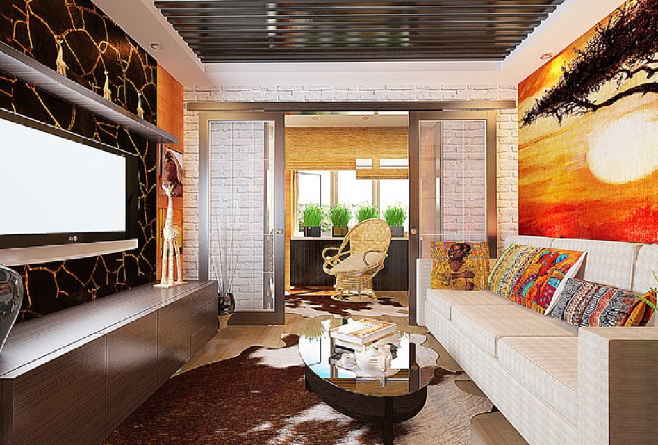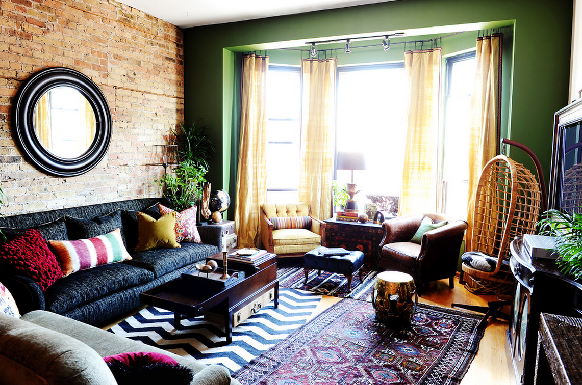 Les briques de tuiles de couleurs rouge et brun-rouge peuvent être combinées de manière surprenante avec des tissus et des tapis aux couleurs vives avec des motifs et des ornements africains, latino-américains ou asiatiques.Toutes sortes de céramiques colorées, des souvenirs des pays de l'Est et d'Asie, des plafonniers peints de lampes de table, des coussins et des couvertures multicolores, tout cela contribuera à créer une atmosphère chaleureuse et confortable.