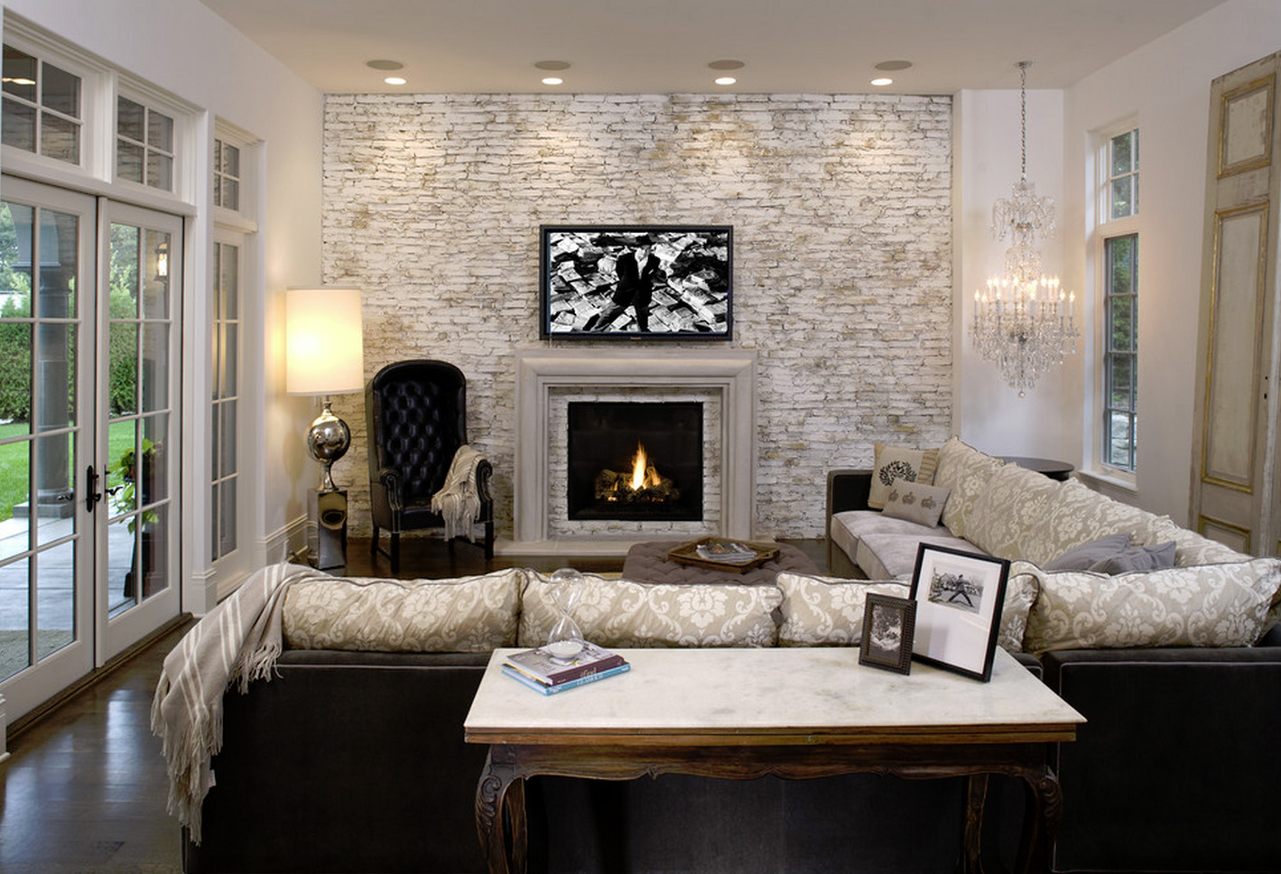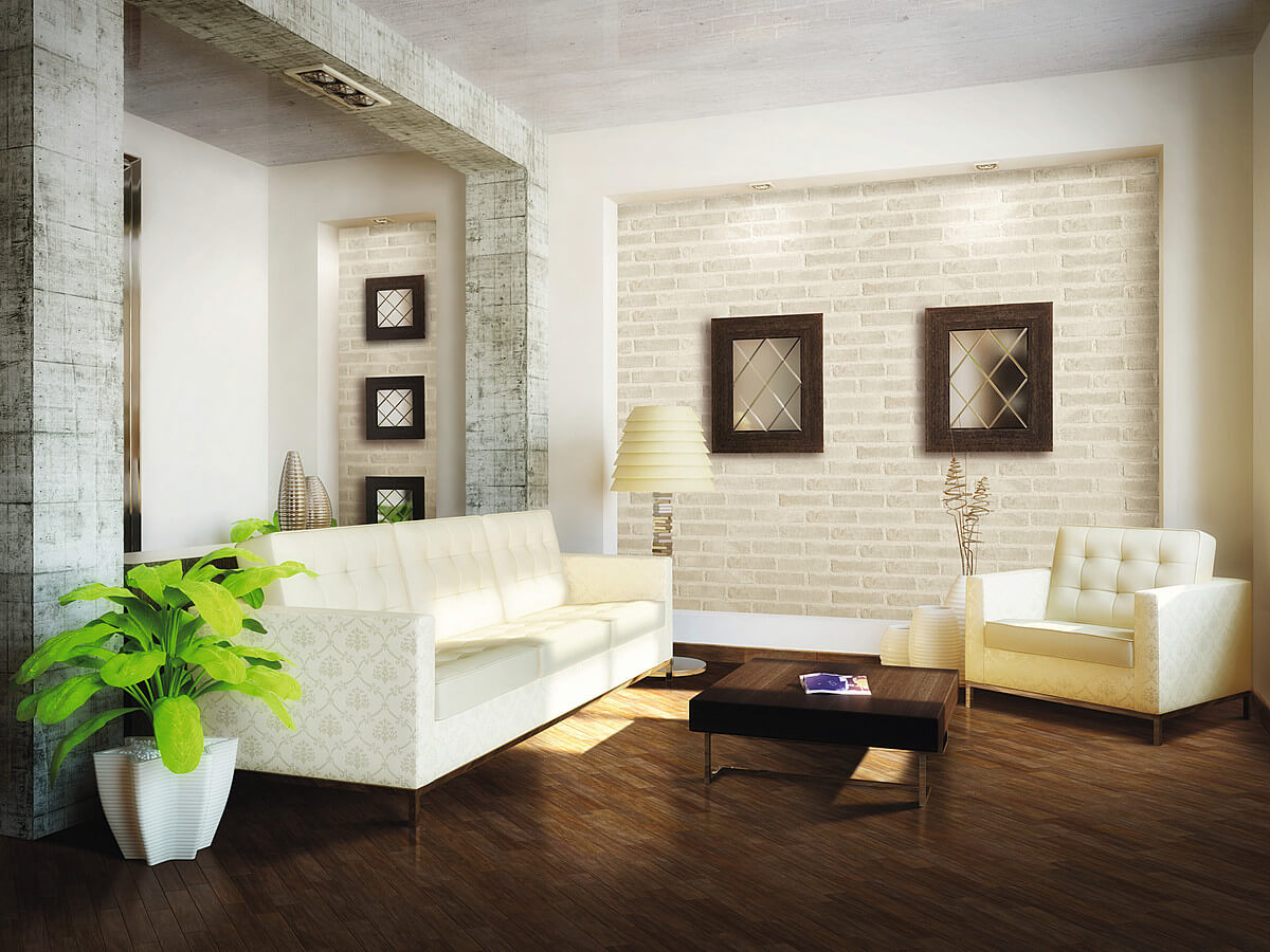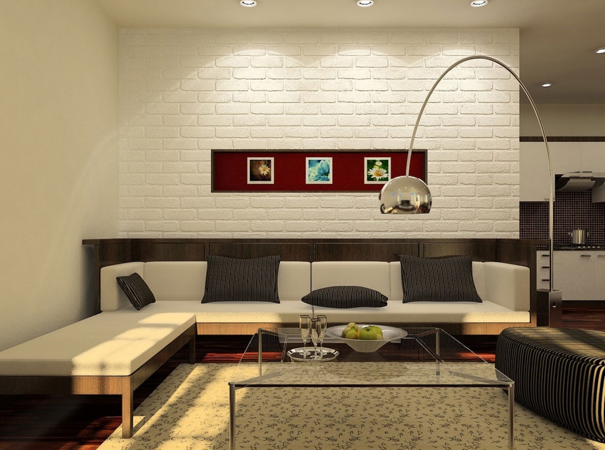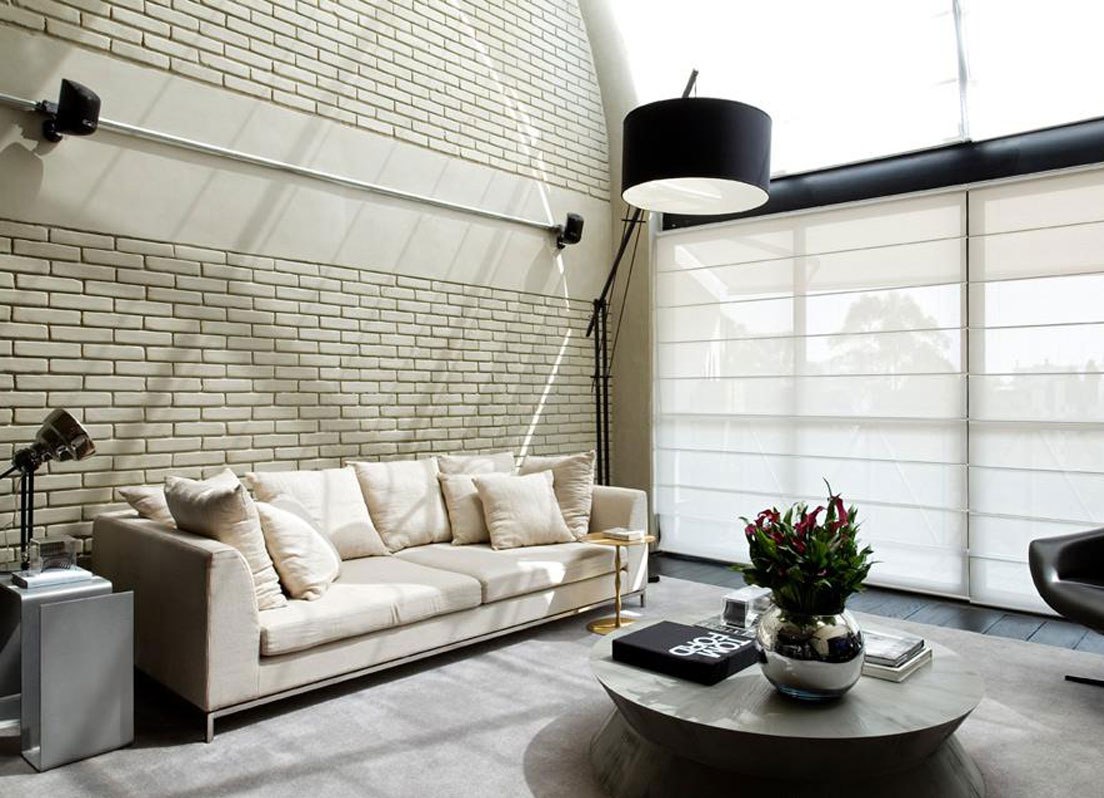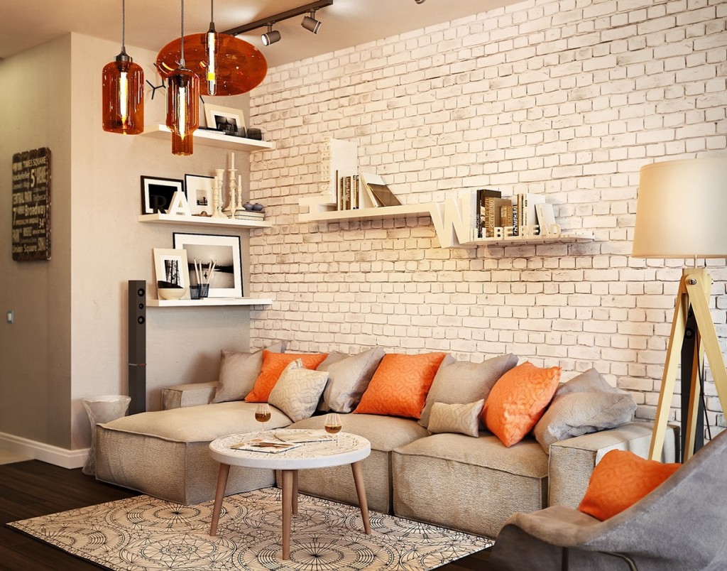 Une solution intéressante sera le salon est décoré de briques blanches l’essentiel est de ne pas oublier de diluer l’intérieur général de la pièce avec des détails clairs pour que la blancheur des murs ne semble pas aveuglante et stérile.