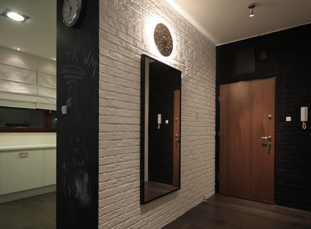 Une tuile en brique peinte dans des couleurs claires (gris, beige, blanc) ou inversement, une tuile noire donnera une touche discrète aux murs de la pièce et, si nécessaire, ajoutera du contraste à la pièce.