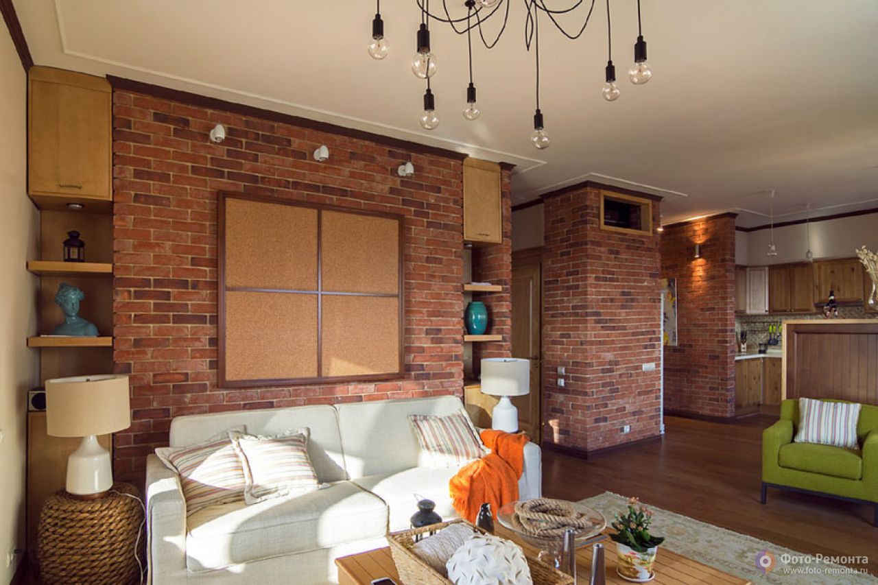 La tuile de brique dans les chambres dans le style d'un pays et dans un style ethnique est parfaite. Malgré le facteur qui s'unit au style industriel, à savoir le mur de briques, le but des conceptions de ce type est très différent. Ils aident à adoucir l'industrialisme délibéré de la pièce, à éliminer les sévérités excessives.