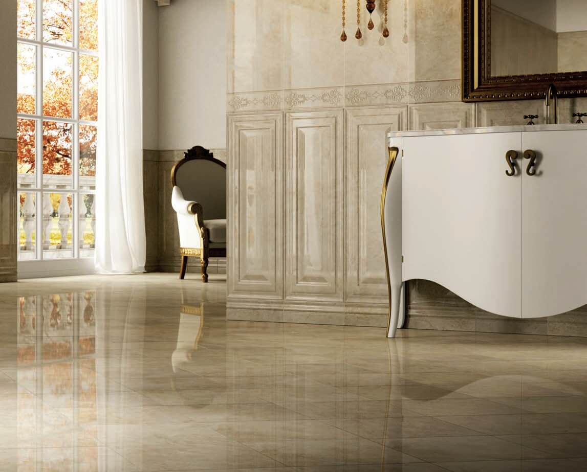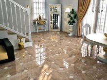 - Tuile brillante. Les produits en marbre naturel sont polis pour obtenir une surface parfaitement lisse et uniforme, avec un brillant brillant et une réflectivité élevée.Pour la décoration intérieure, cette qualité est très bénéfique, car cette tuile a un aspect spectaculaire et coûteux en raison des jeux de lumière. Cependant, l'apparence d'une surface parfaite sous l'influence de l'humidité peut être très glissante, il est donc préférable de ne pas utiliser ce type de carrelage pour les revêtements de sol.