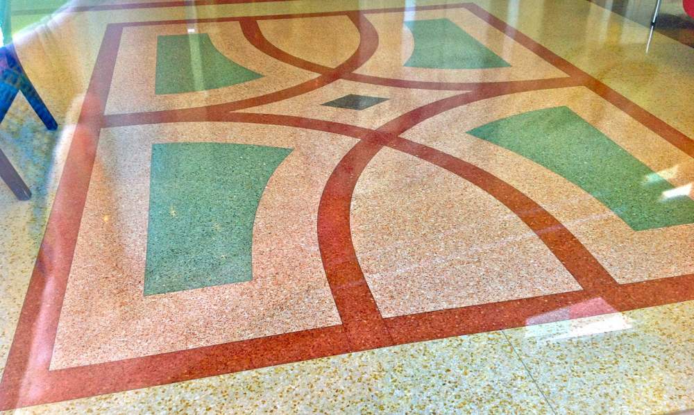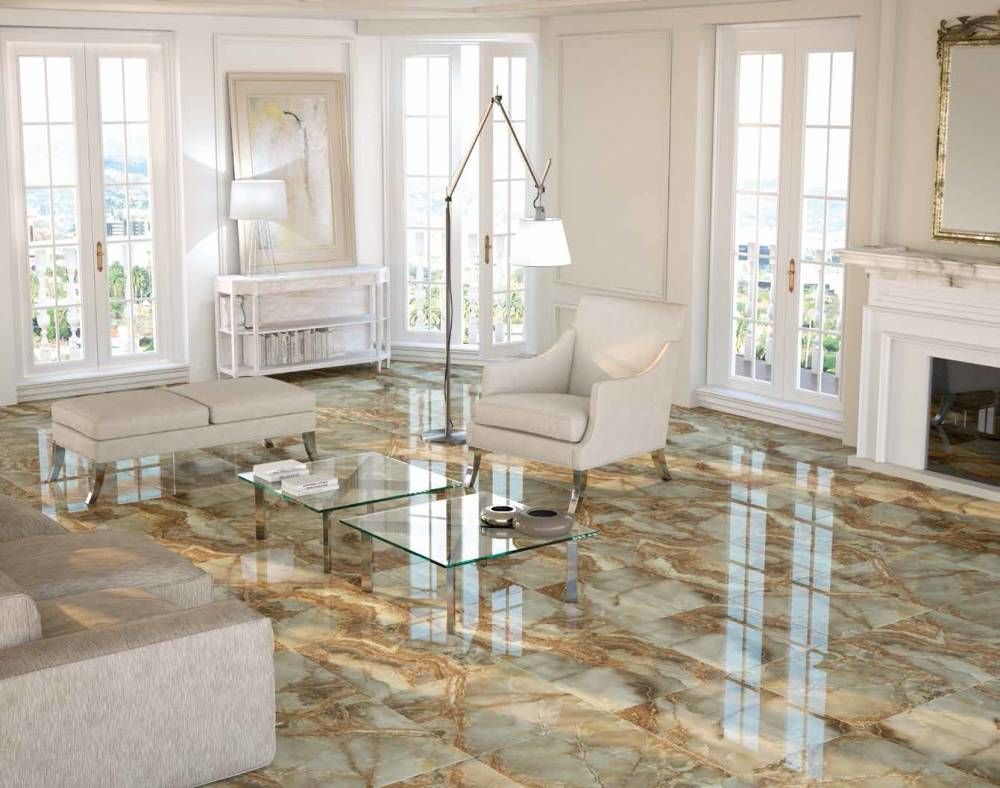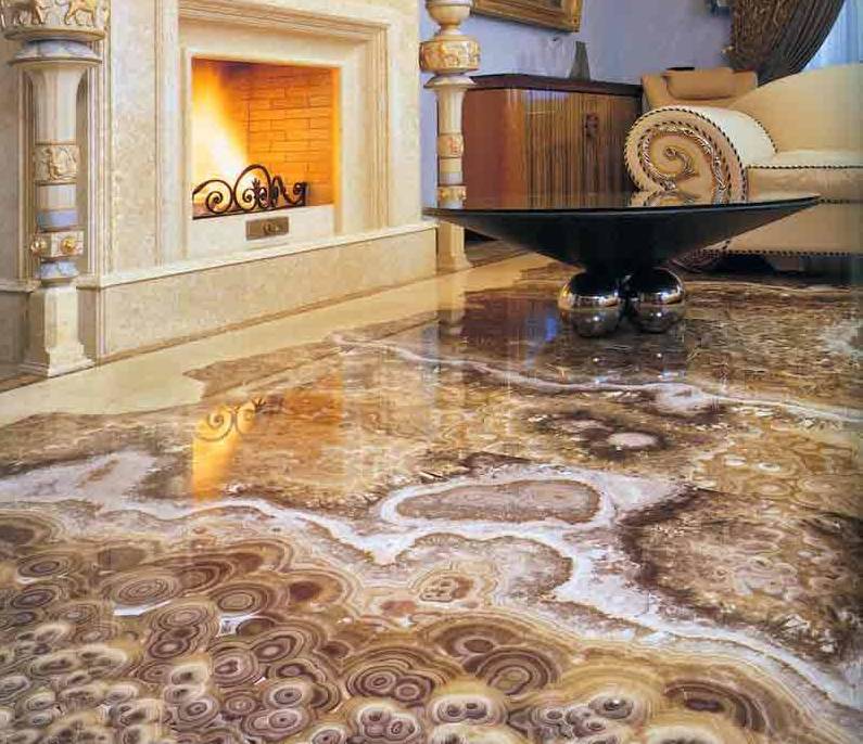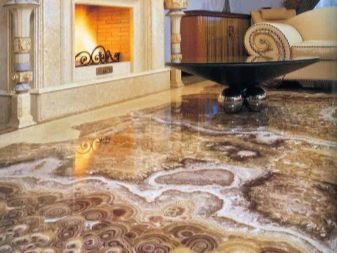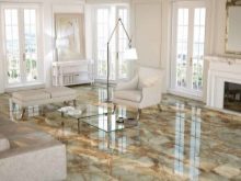 - Dans la conception du sol ne devrait pas avoir peur des couleurs non traditionnelles. Par exemple, une couleur de marbre turquoise foncé décorera le salon dans un style néoclassique. Les murs clairs et les meubles simples joueront d'une nouvelle manière, combinés à une teinte noble et à une finition texturée intéressante au centre de la pièce. Ainsi, le sol devient l'élément central du décor de la pièce.