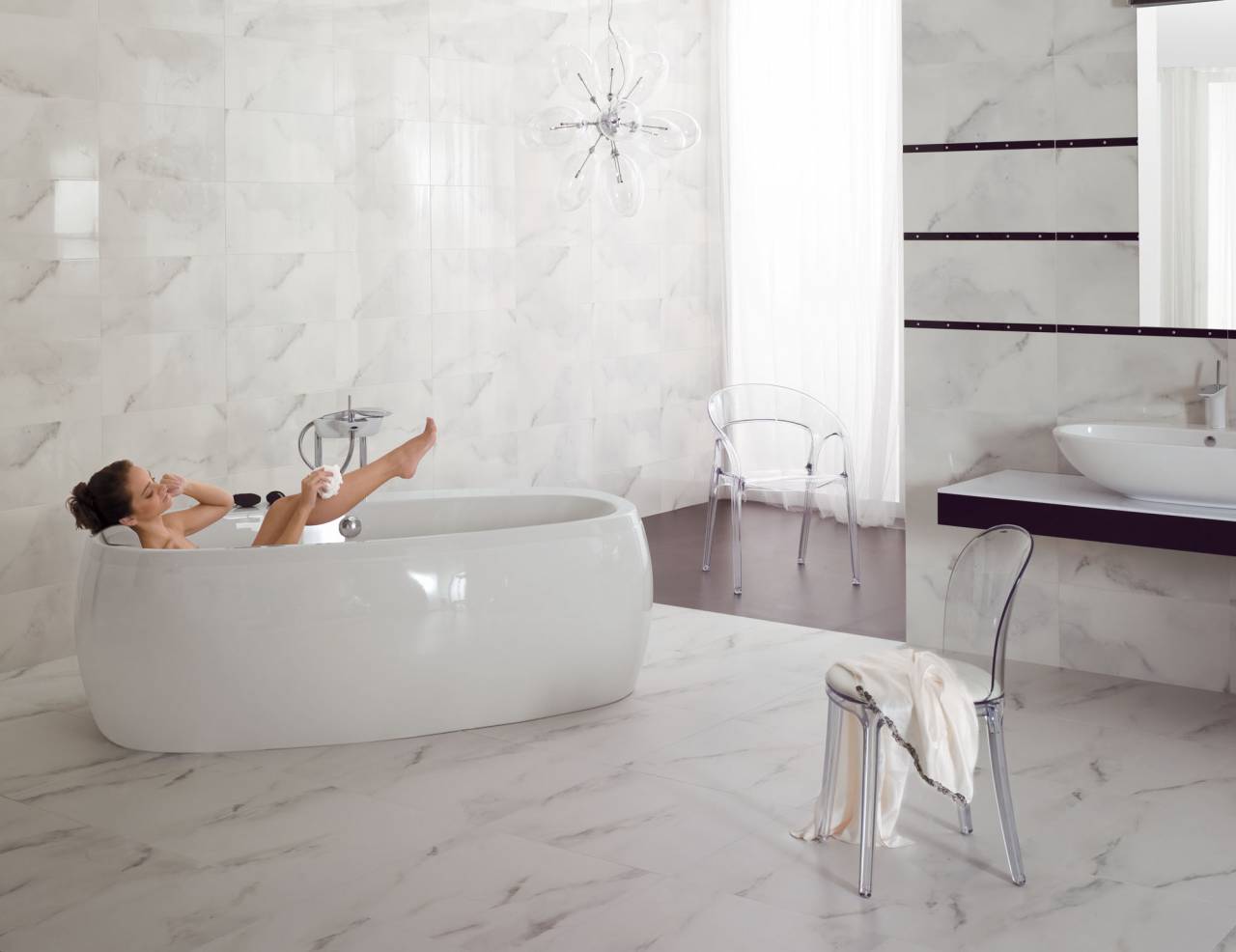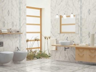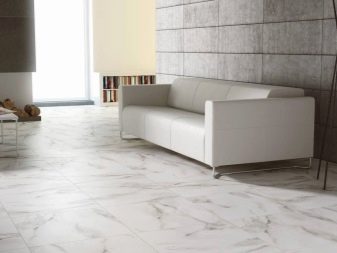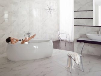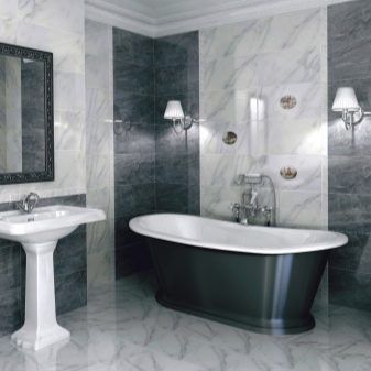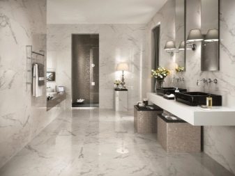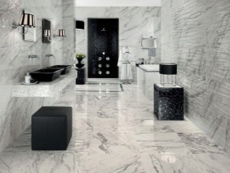 - Carrelage marbré. Grâce à la haute technologie et aux derniers développements, les fabricants ont appris à imiter les motifs naturels de la pierre sur des carreaux de céramique. Le résultat est une belle finition avec des "veines de marbre" d'apparence naturelle de différentes nuances, mais les produits sont plus minces, plus faciles à installer et à entretenir et beaucoup moins chers. Toutefois, si vous choisissez des produits de marques célèbres, les prix peuvent être très élevés.
