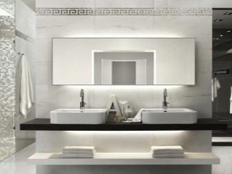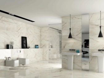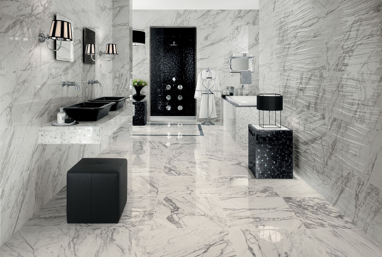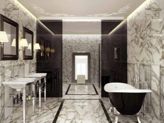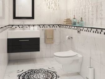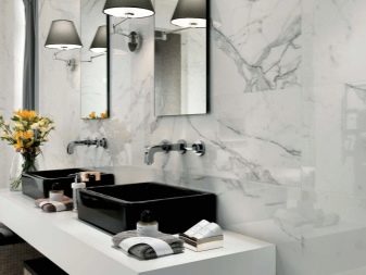 - La plupart couleur de marbre universelle - blanc, il peut être la base pour mono-intérieur. Le résultat est un design léger et léger qui, si désiré, est facile à compléter avec des accessoires brillants, ce qui lui donne une ambiance différente. Un ton léger mettra parfaitement en valeur la couleur noire de la finition des murs de l'intérieur high-tech. Il est préférable d’utiliser des textures brillantes, des robinets métalliques élégants sur la plomberie, des miroirs inhabituels et des lampes encastrées strictes au plafond. Le monochrome et la sévérité de la combinaison de ces deux teintes trouveront également une excellente application dans le style du minimalisme.