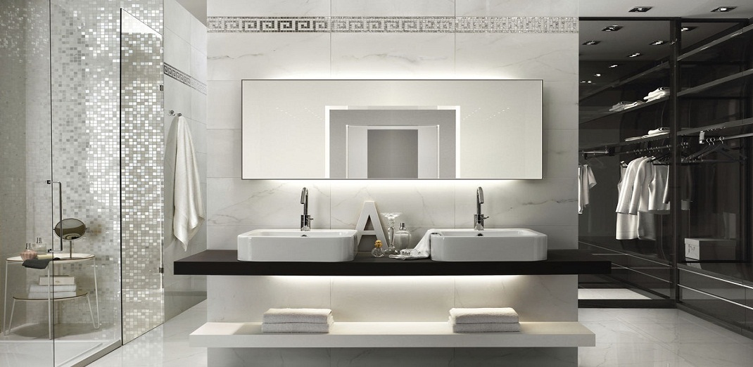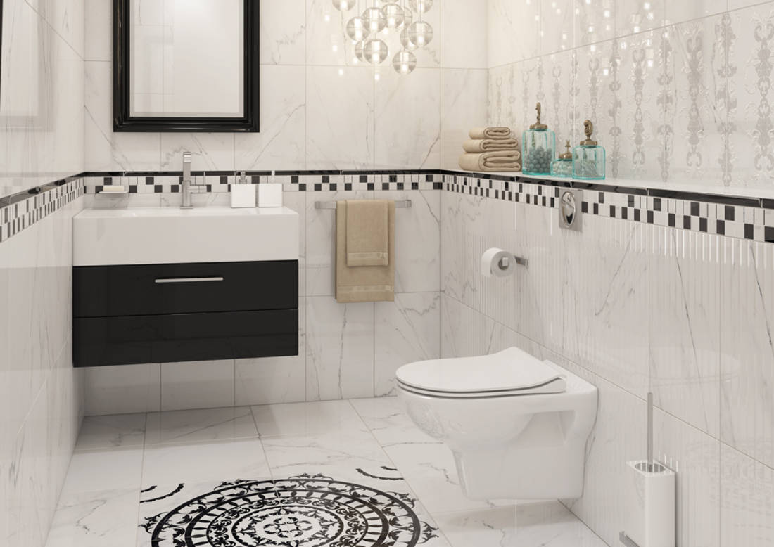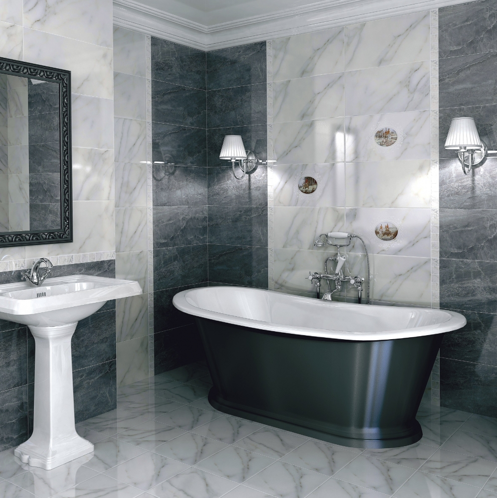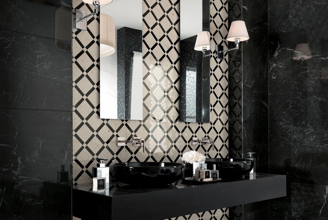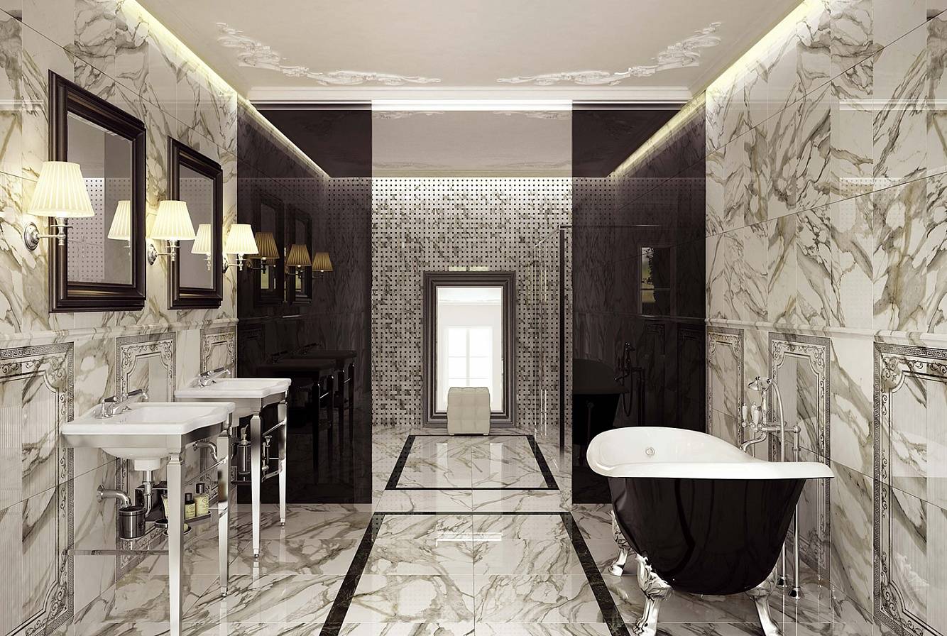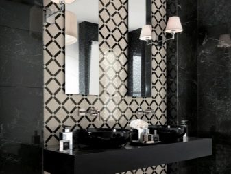 - Un design glamour et spectaculaire inspiré d’Hollywood et de vieux films peut être réalisé en posant des carreaux noirs avec des traînées claires et une texture brillante.Le rétro-éclairage va ajouter du design à la glamour. Des garnitures dorées sur les murs et les meubles complèteront le look branché et élégant de la salle de bain.