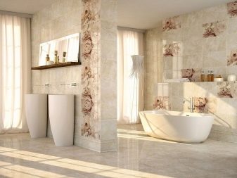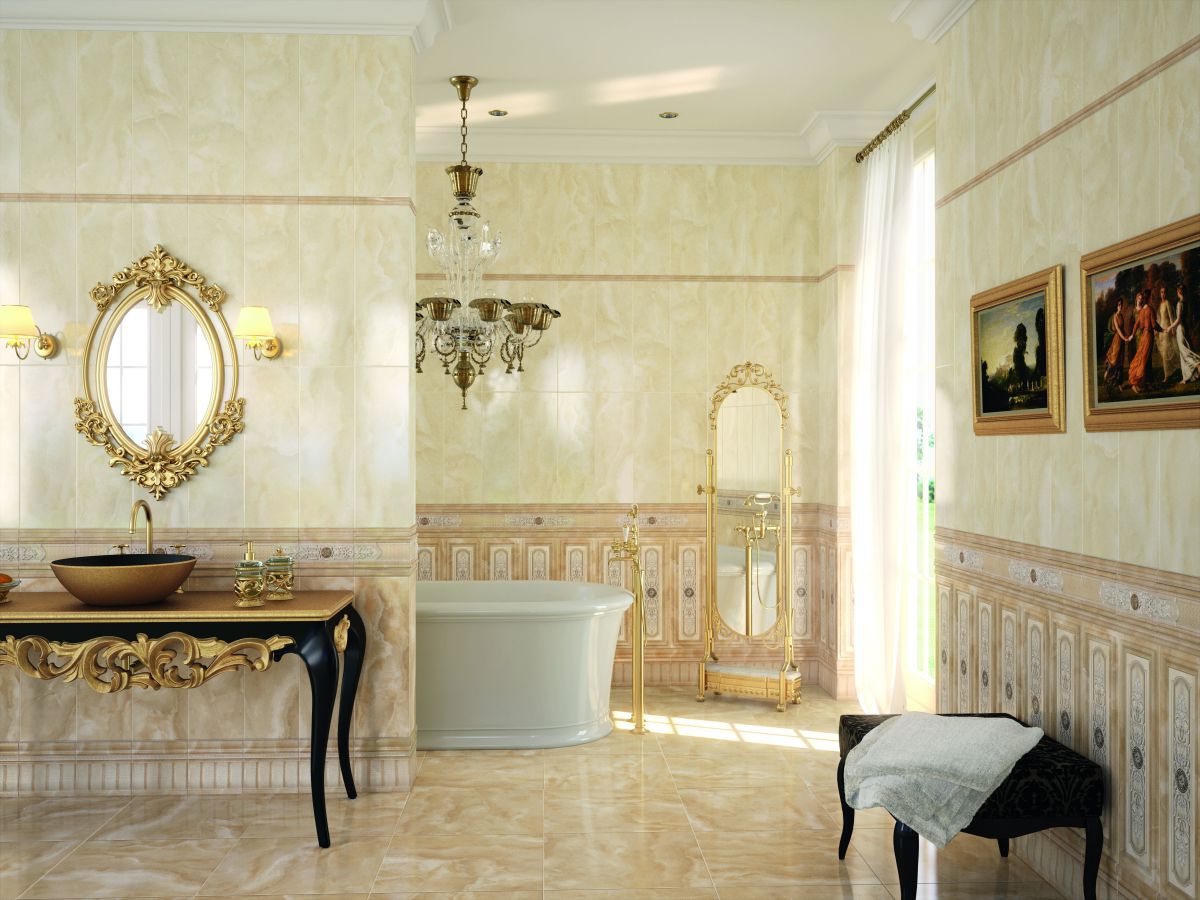 - Palette beige convient à la décoration de salles de bains ou autres pièces de style classique. Le sol est joliment décoré de carreaux marron à rayures dorées. La conception peut être complétée par des miroirs dans des cadres en métal, des mélangeurs et des raccords dorés.