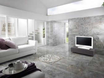 - Texture mate nuances de gamme de lumière rafraîchira les salles spacieuses ou les petits couloirs. La finition transparente souligne particulièrement efficacement le caractère naturel du revêtement en pierre.