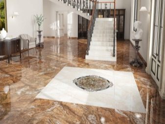 - Pour une entrée spacieuse, installez une teinte brune chaleureuse avec des stries prononcées. Pour rafraîchir la surface et améliorer l'effet de luxe, vous pouvez ajouter un insert en marbre clair avec un décor au milieu. Le dessin diluera l'intérieur, apportera un soupçon de la décoration douillette et légère des anciens édifices grecs à la rigueur et à la pomposité du palais.
