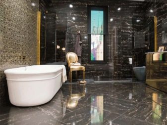 - L'abondance marbre noir dans une grande salle de bains sera une excellente base pour la décoration dans le style noir ou gothique. L'effet du mystérieux château sera soutenu par des bougeoirs imitant des bougies, des cadres en miroir en métal noir et des meubles en métal sur pieds torsadés.