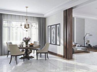 - Un salon simple et classique ne peut tout simplement pas se passer de carreaux de marbre disposés dans des carrés séparés. Les lignes claires et les tons calmes de noir, brun et blanc sont propices à la pacification, à la concentration et au repos confortable. La taille de la pièce vous permet de "respirer librement" dans une pièce aussi élégante et concise.