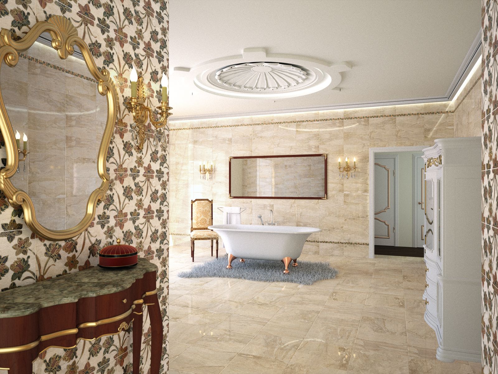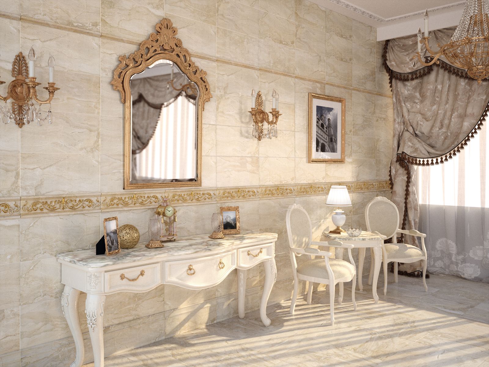 - Nuances de marbre peut également être applicable dans divers cas.Une tuile rouge avec un effet vieilli décorer les sols dans la salle de la cheminée ou le hall d'une grande maison de campagne. La surface d'aspect ancien des étages inspire les châteaux médiévaux et les salles du trône des palais. Un effet intéressant à cet égard sera l’utilisation d’une gamme de nuances de vert ou de bleu. Ces couleurs sont également caractéristiques des intérieurs baroques et rococo. Les murs en malachite ou les nuances de la mer se marient à la fois dans la salle de bains et dans la décoration des salons combinés à des salles à manger.