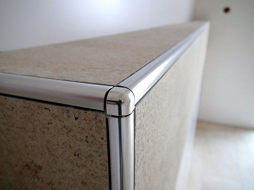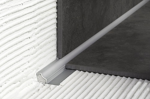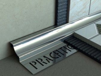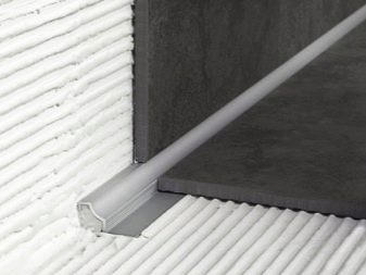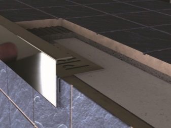 Ce type de profil n'est pas utilisé aussi souvent, mais il a bien fonctionné comme un beau design de la transition entre la salle de bain et le mur. Les surfaces de mise en page en céramique sont attrayantes, ces profils sont durables. Cependant, ils peuvent se séparer si quelque chose de lourd leur tombe dessus.