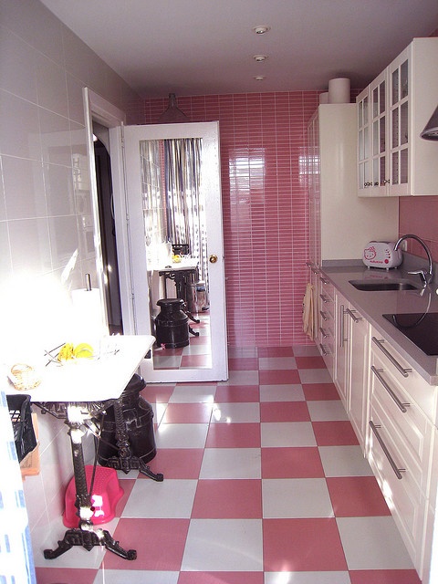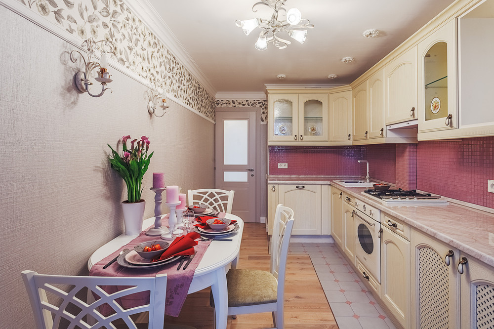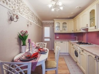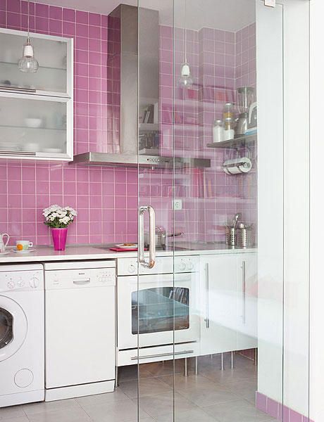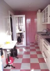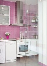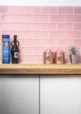 La fantaisie de conception sur la pose de carreaux de céramique dans la cuisine s’applique à toutes les surfaces. Dans cette salle, vous pouvez poser des carreaux roses sur le sol et sur les murs avec une toile. Mais les idées créatives des concepteurs ne s'arrêtent pas là.