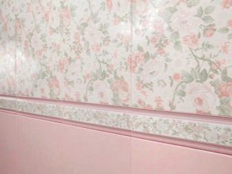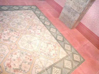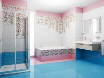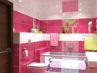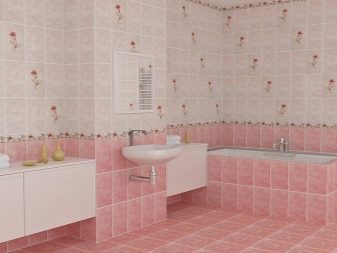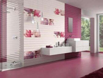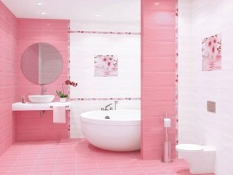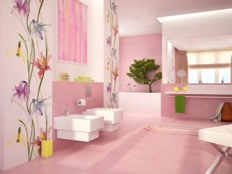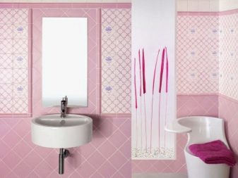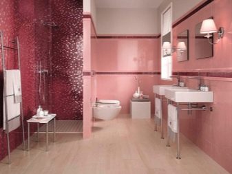 La combinaison de deux nuances de rose est également pertinente. Dans ce cas, les concepteurs proposent de finir le sol et le plafond avec une nuance plus foncée et des murs clairs. Avec cela, il aura l'air non seulement d'un carreau rose pur, mais également d'une céramique à la texture mate inhabituelle ou à des motifs lumineux.