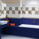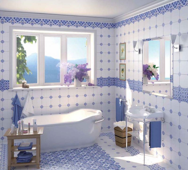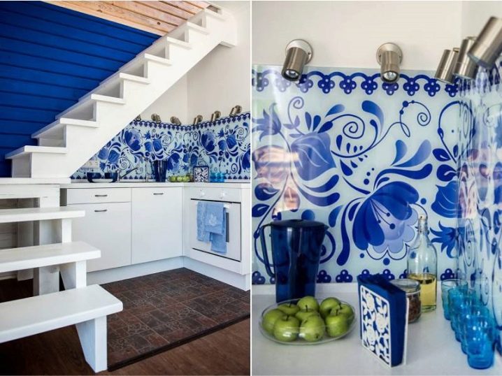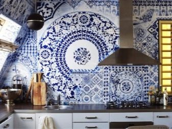 - Expressivité. Si l'intérieur manque de motifs et de décorations, faites attention au style Gjel - il s'agit d'un ornement bleu sur fond blanc, le motif est composé d'éléments végétaux et d'autres détails. Une telle tuile peut être utilisée pour désigner une zone séparée dans la pièce, ainsi que pour l’utiliser pour la décoration des angles et des entrées.