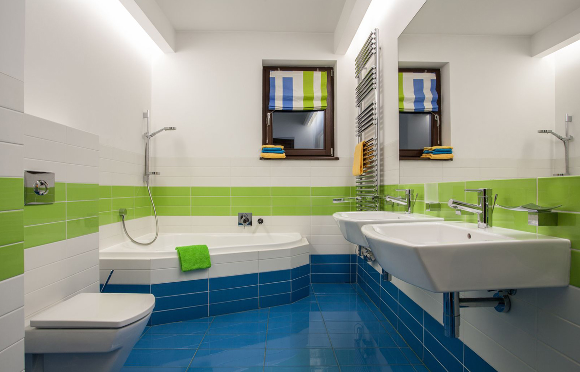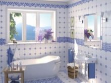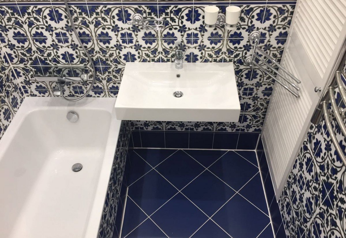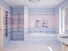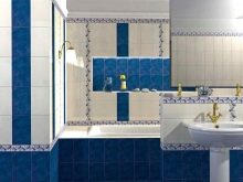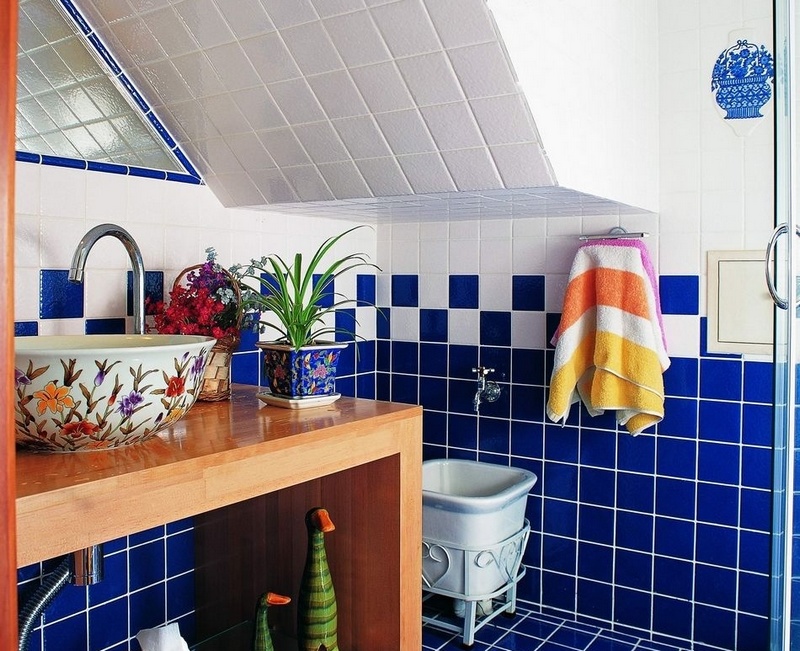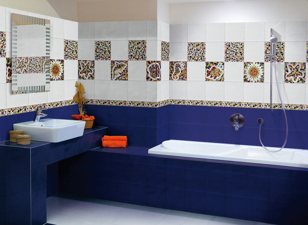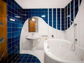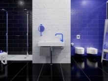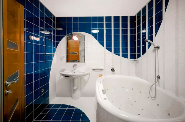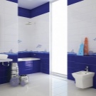 - Décoration spectaculaire de la salle de bain. Les concepteurs ont tiré parti d’une combinaison contrastée associant des carreaux bleu foncé et blanc neige.
