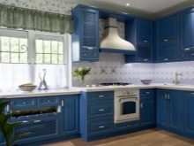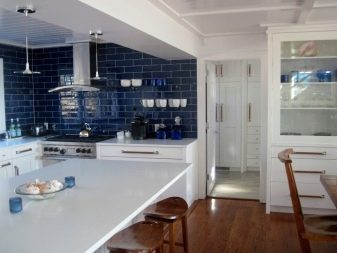 - Les décorateurs ont décoré l'espace de travail en carreaux bleu foncé de la cuisine. Horizontal meurt en couleur saturée en harmonie avec les meubles blancs.