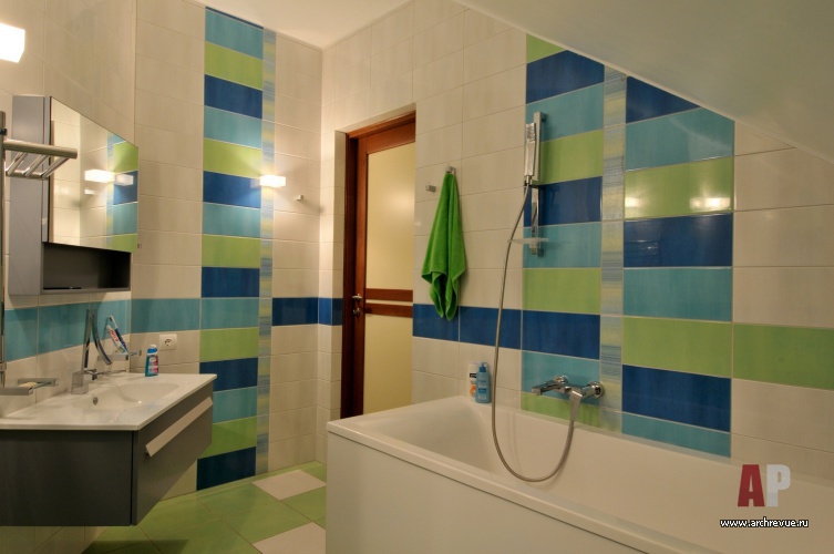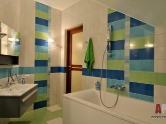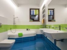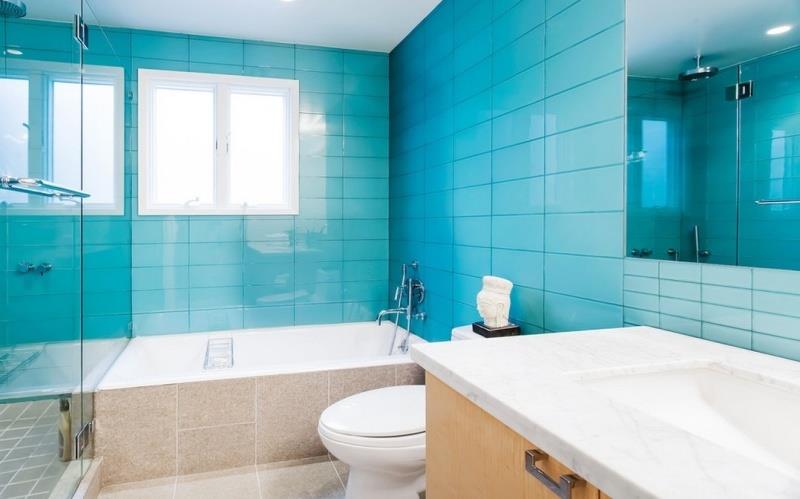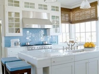- L'utilisation de carreaux bleus a permis de créer une atmosphère fraîche et légère dans la pièce. Les matrices avec une texture brillante dissuadent doucement la lumière naturelle.