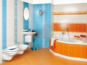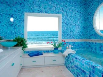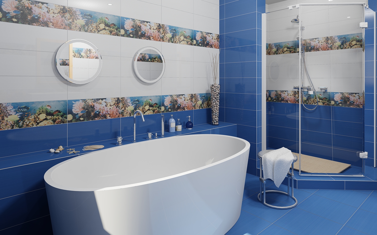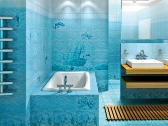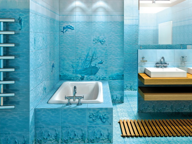 - Thème nautique classique. Les tuiles sont décorées d'images de créatures marines et de la surface de l'eau. Le matériau de finition est peint dans des tons clairs et doux.