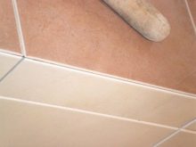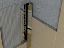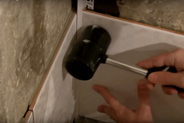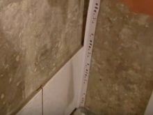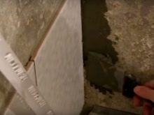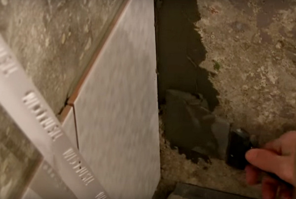 - Avant de commencer les travaux de revêtement du deuxième mur, la rainure de finition doit être insérée dans la dalle de carrelage à laquelle l'autre mur de la pièce est confronté. En même temps, il est nécessaire de respecter scrupuleusement les dimensions de la rainure - sinon, avec une taille de rainure plus petite, cela ne fonctionnera pas. Pour des rainures plus larges, vous devrez utiliser plus de mastic.