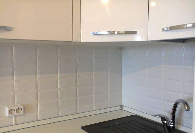 - Le matériau en mosaïque est placé contre le tracé - vous devez toujours contrôler le niveau vertical.