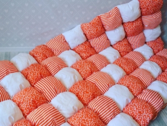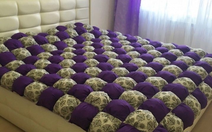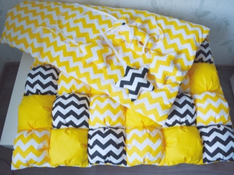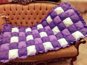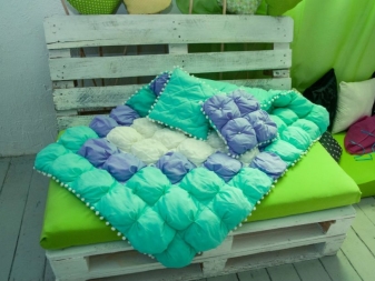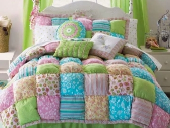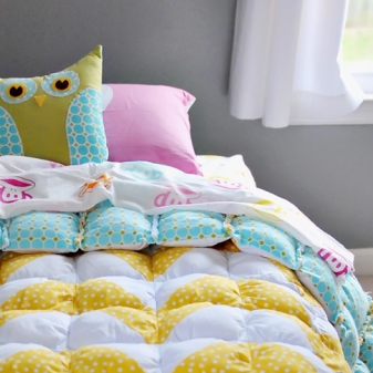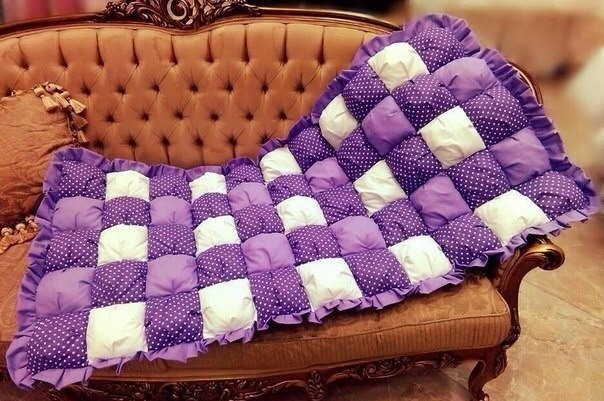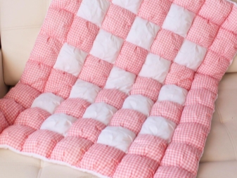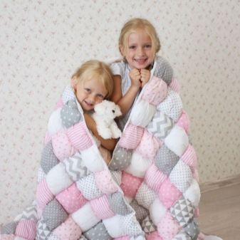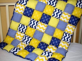 Pour la fabrication de telles couvertures, on utilise des tissus d'intérieur modernes. Des impressions et des combinaisons de couleurs intéressantes sont sélectionnées. Vous pouvez assembler une couverture de tissus monophoniques, en inventant une paire magnifique et originale, par exemple, bleu avec jaune, bleu avec rouge, rose avec gris, jaune avec marron.