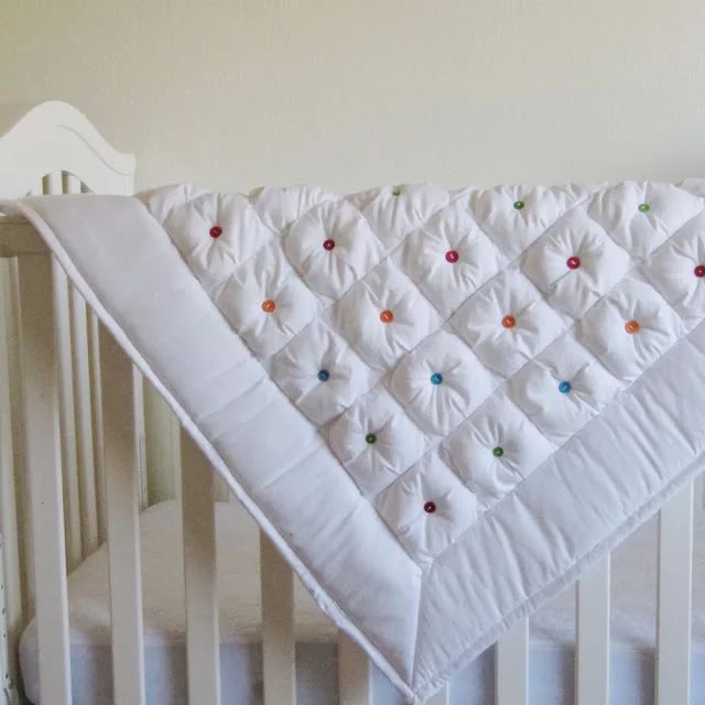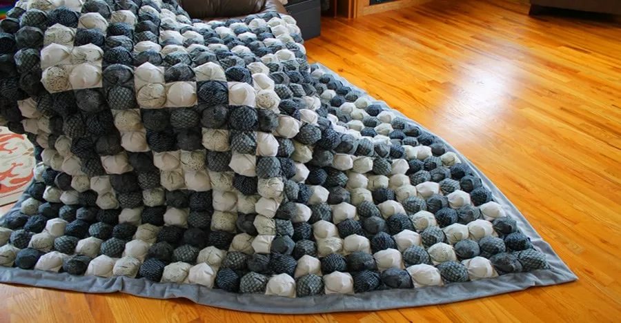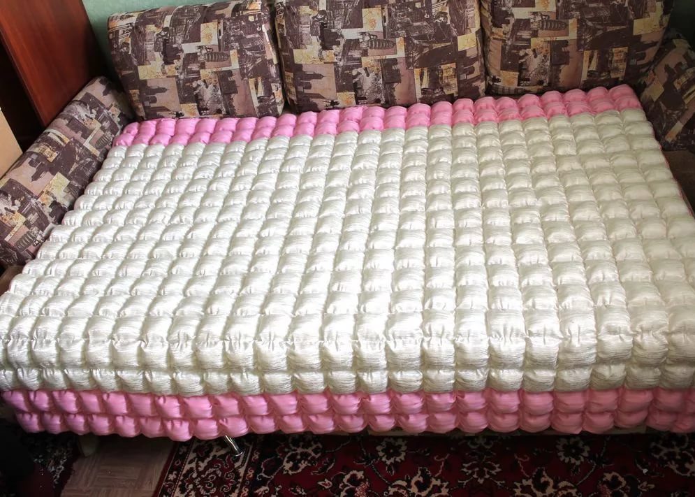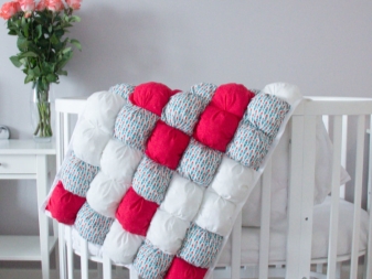 Parmi les faiblesses de ce produit, on peut noter qu'il est coûteux (il est fabriqué exclusivement à la main et le processus n'est pas trop compliqué, mais il nécessite de la précision et du travail acharné). La taille moyenne d'une couverture pour bébé coûtera environ 5 000 roubles. Il est également fantaisiste dans les soins - il doit être lavé avec des moyens délicats, séché dans sa forme redressée, en redressant chaque patin avec les mains de façon à ce qu'il ne s'empile pas. Le repasser avec un fer à repasser ne réussira pas non plus - vous devrez utiliser la technique du «coup de vapeur» ou marcher prudemment avec un bateau à vapeur.