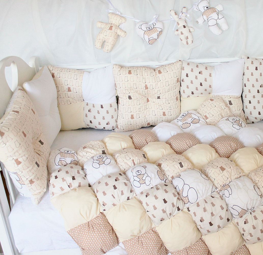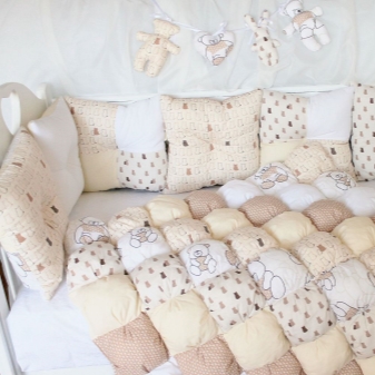 Il aura l'air très bel ensemble de "biscuit" textiles - un couvre-lit et des oreillers ou un couvre-lit et des côtés mous dans le berceau.