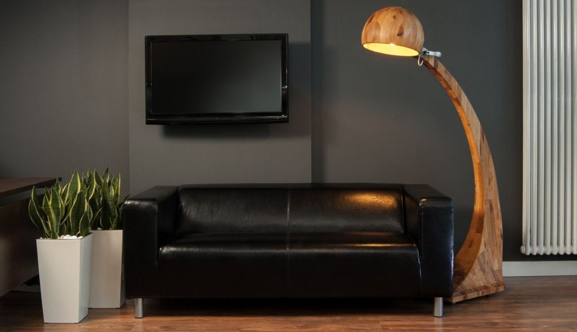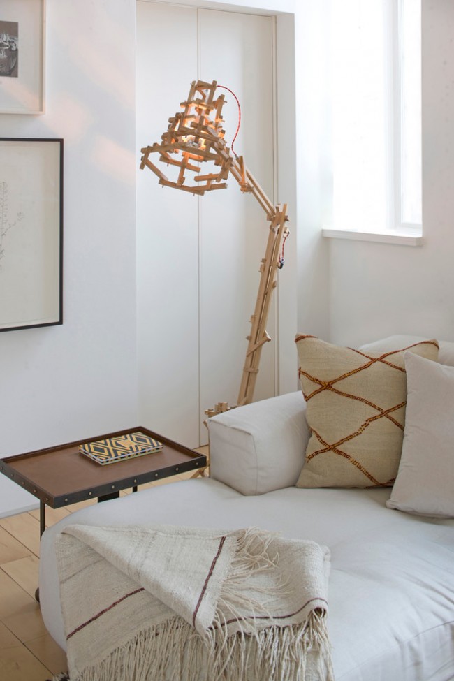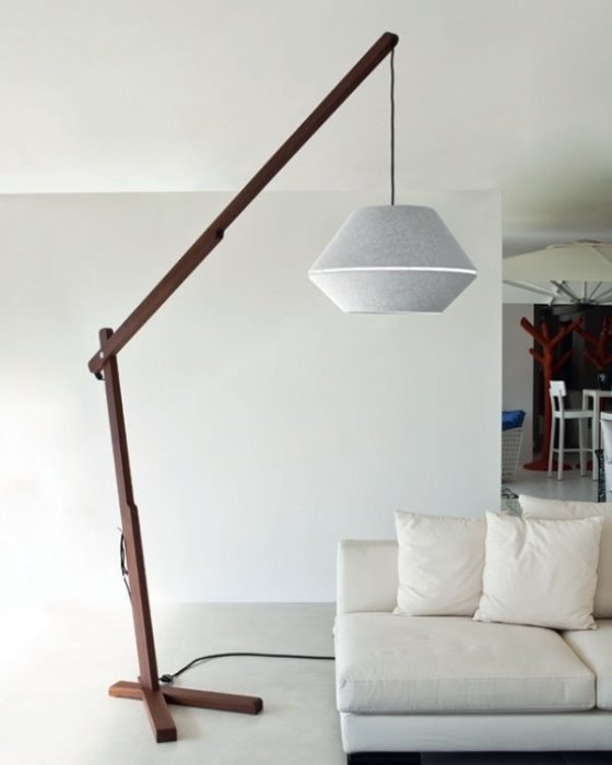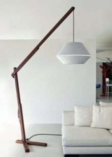 Lampadaire en bois s'intégrera dans l'intérieur moderne. Canapés en cuir, couleurs sombres, lignes droites et absence totale de petit décor. Cette lampe ajoutera à la pièce douceur et couleurs chaudes. Ici, une lampe de sol peut être la forme la plus bizarre. L'éclairage peut être un véritable objet d'art.