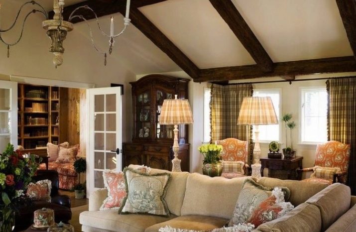 L'illuminateur en bois clair complète parfaitement l'intérieur dans le style d'une maison alpine simple. La fraîcheur d'une telle pièce mettra en valeur la lampe sur pied de la jambe courte de la forme classique.