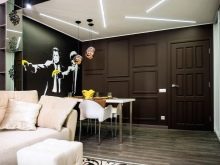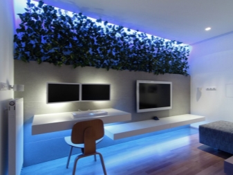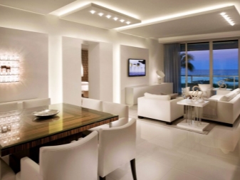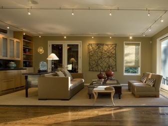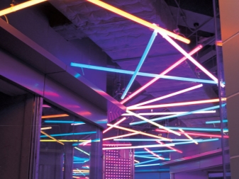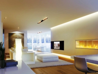 La zone de leur luminescence est assez étendue, ils distribuent bien la lumière. Les lampes fluorescentes vous permettent également de jouer avec la lumière de la maison. Ainsi, vous pouvez installer des produits avec différents types de lumière en couleur et en luminosité, plaçant ainsi des accents intéressants dans la pièce. Cette option est idéale pour le zonage de studios et d’autres types de locaux.