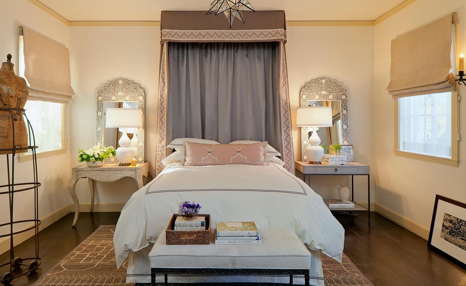 Le placement le plus courant d'une lampe de table dans la chambre à coucher - sur la table de chevet. C'est utile pendant la lecture de nuit et d'autres activités après le coucher du soleil. Pour cette zone de la maison, on utilise des modèles compacts qui ne prendront pas beaucoup de place sur la table de chevet. Il est souvent placé heures, photos, réveil, livres, magazines et autres articles.
