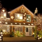 Avec l'aide de guirlande LED, vous pouvez décorer non seulement la façade. Décorez si souvent le toit, les portes, les fenêtres, les clôtures, les tonnelles (et même les bancs). Il peut s'agir de lignes fines, ainsi que d'un grand nombre d'ampoules lumineuses qui décoreront toute la surface du toit et des murs. Vous pouvez décorer la maison avec des ampoules brillantes qui scintillent, mais aussi avec des personnages, des inscriptions ou tout autre motif de vacances qui améliore votre humeur.