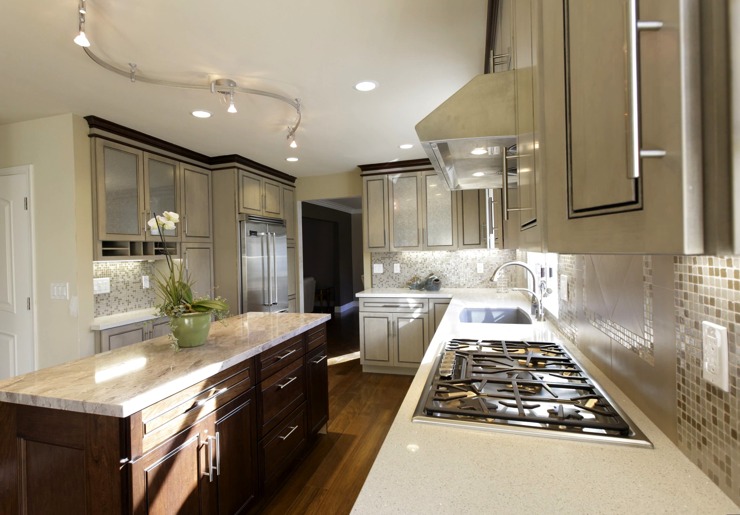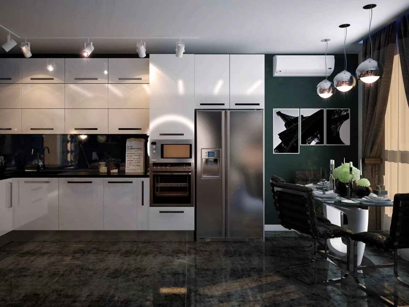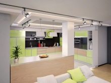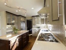 - Dans la cuisine, les rails sont montés au-dessus du bureau, ce qui vous permet de déplacer la lampe au bon endroit. Pour éclairer la surface de travail, il suffit de deux ou trois lampes. Mais la salle à manger dans une cuisine isolée est préférable d'attribuer un abat-jour sur une longue jambe avec une lumière chaude.Cela vous permettra de vous détendre et de soulager les tensions après une journée bien remplie.