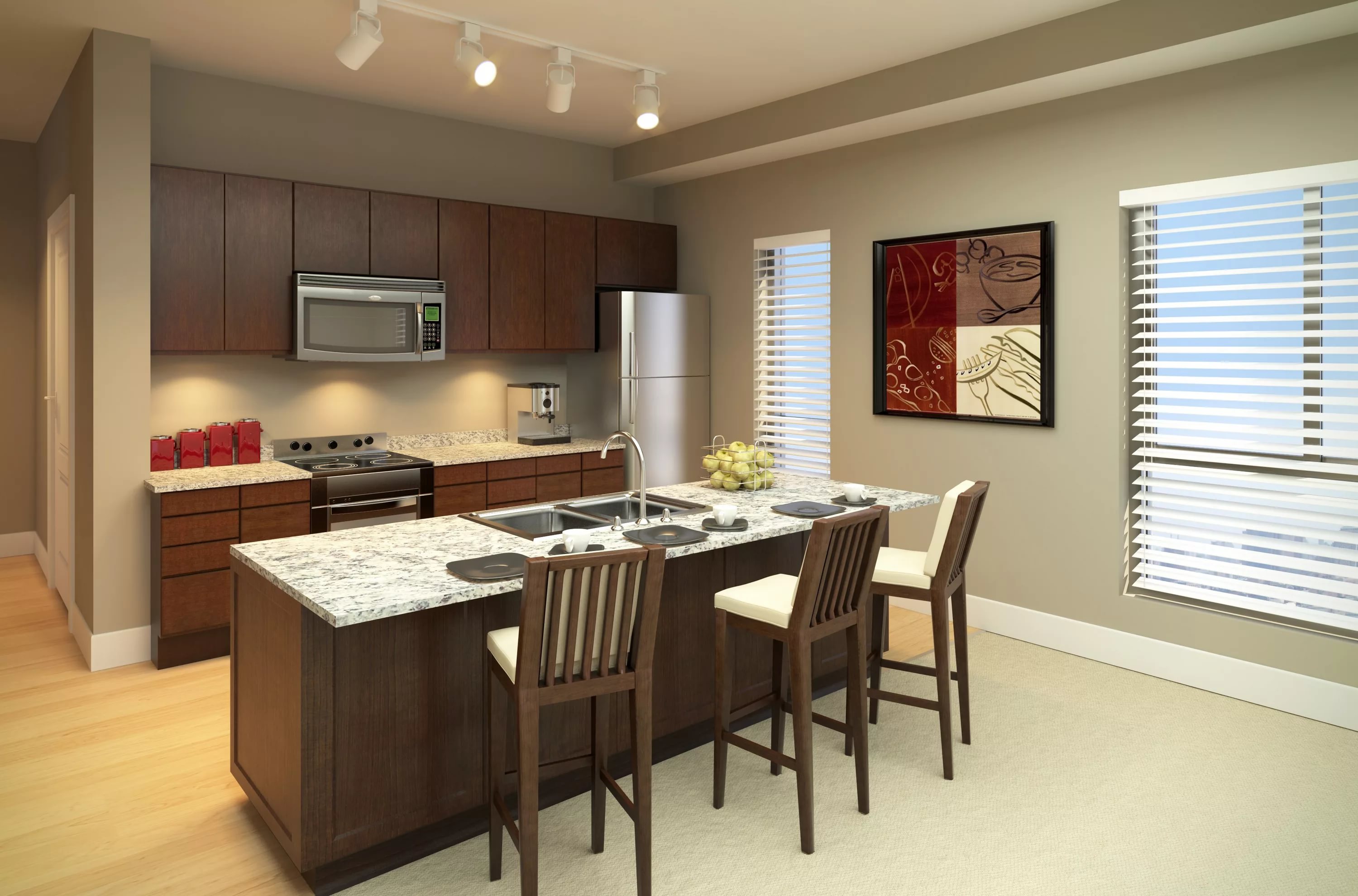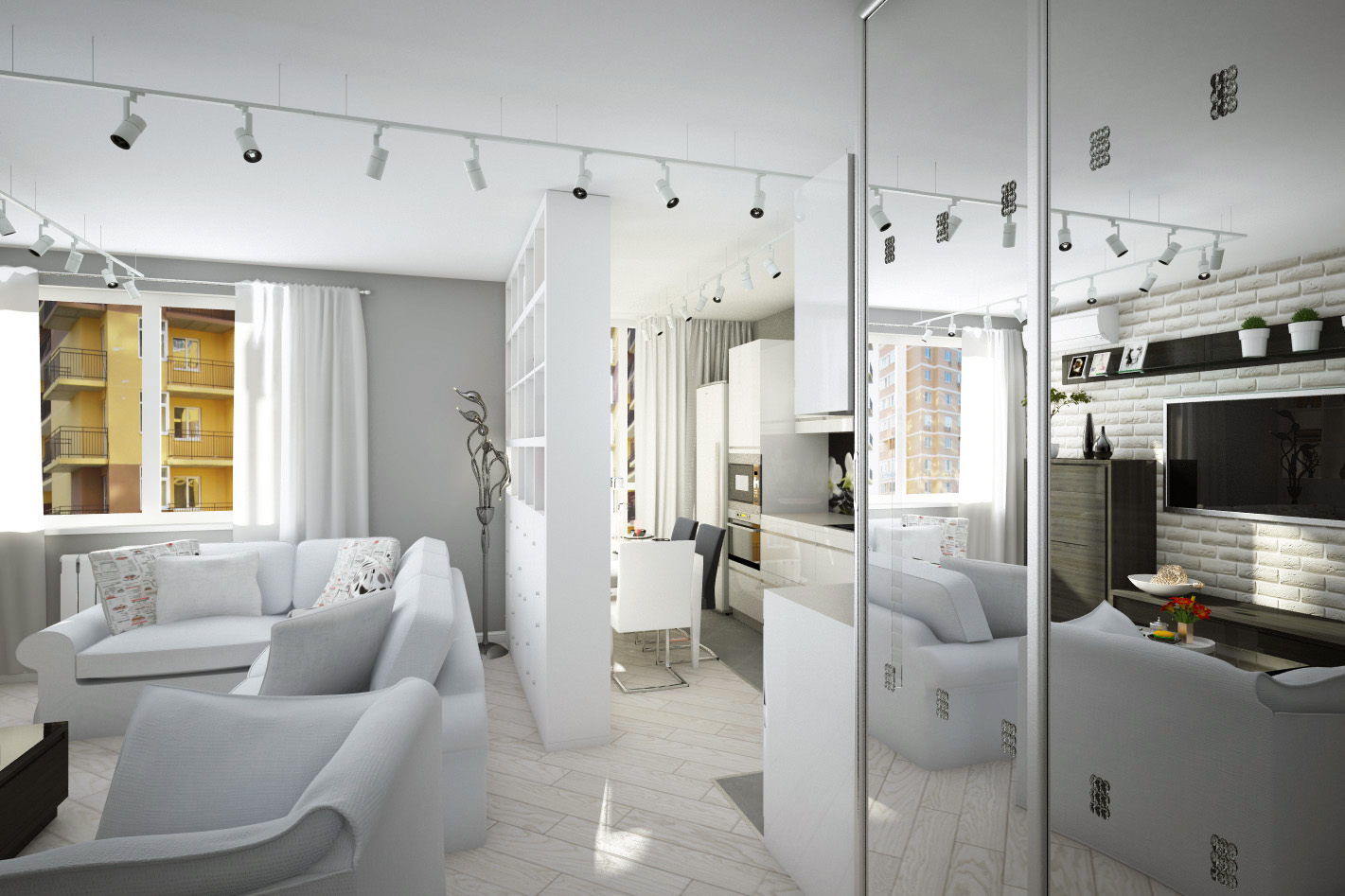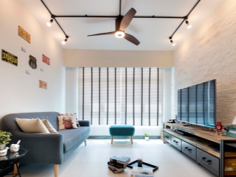 Une des meilleures conceptions qui s'adapte à l'éclairage sur rail est la haute technologie et le loft. Cela est dû au type de mobilier plus «simplifié» et à la répartition zonale de la pièce. C'est une excellente option pour un studio, un appartement ou une chambre d'hôtel.