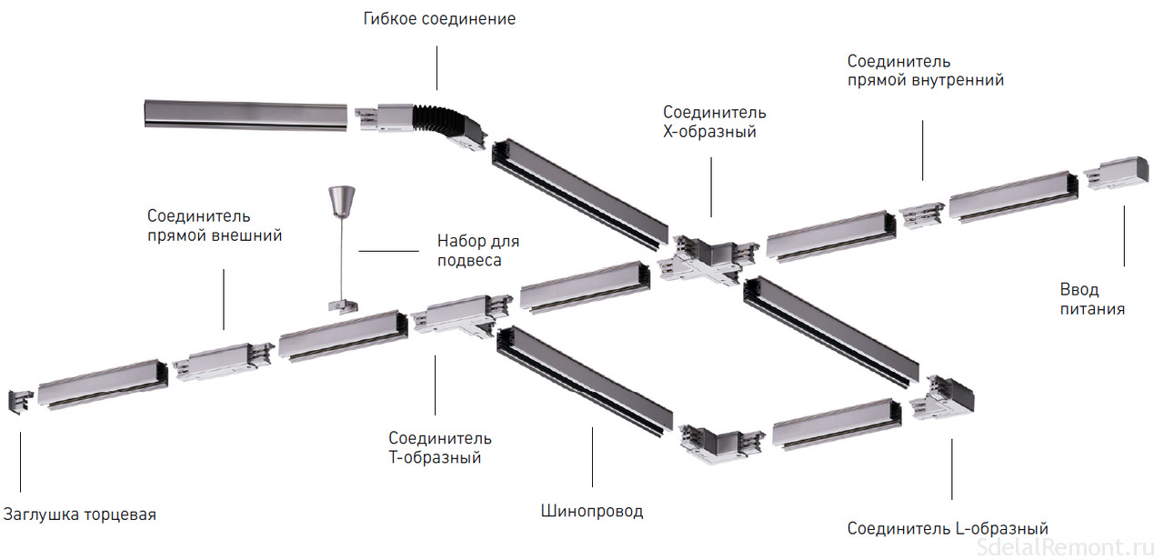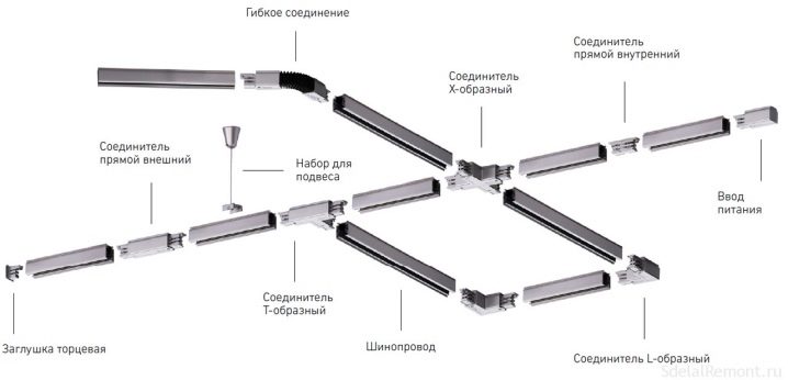 Le système d'éclairage consiste en une ligne de bus, le long de laquelle se trouvent plusieurs lampes similaires, un conducteur, un transformateur, une fixation au mur ou au plafond et des éléments de connexion (si vous souhaitez créer un dessin géométrique du jeu de barres - un carré, la lettre "G", etc.).