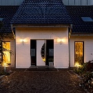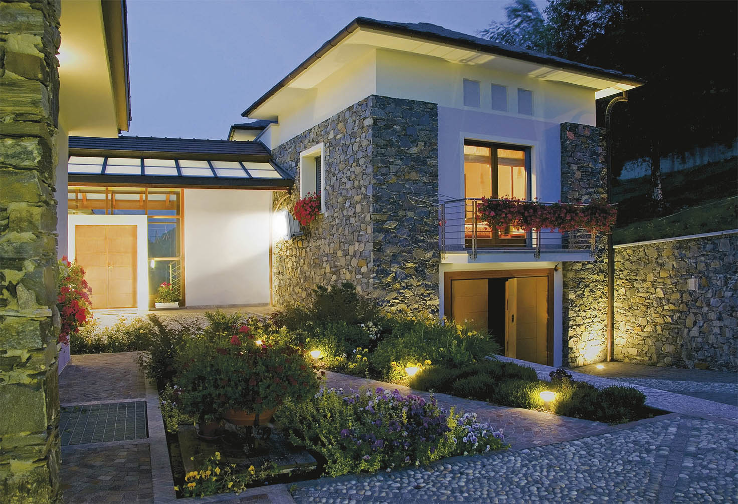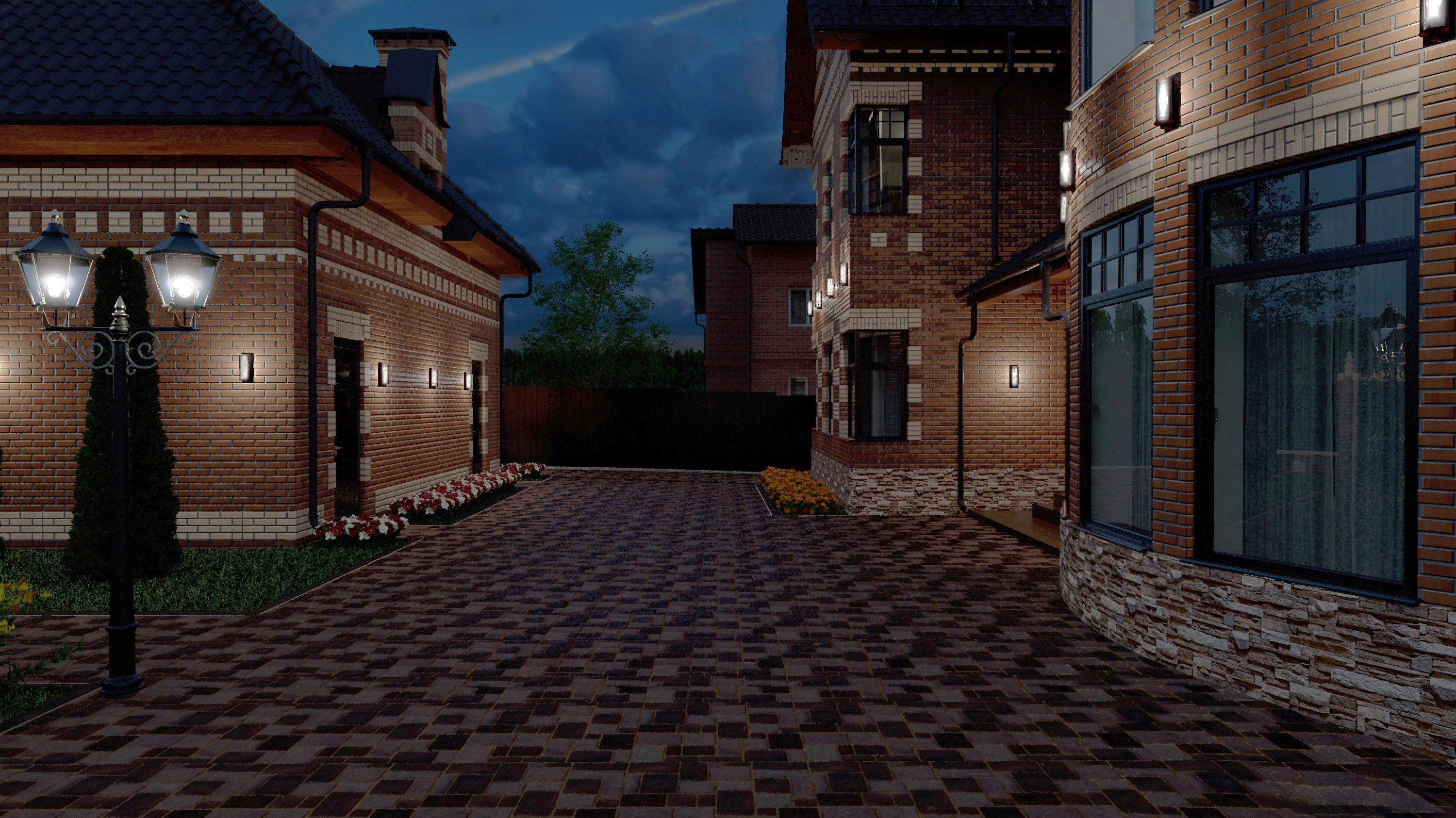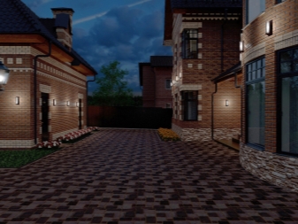 Éclairage approprié de la façade - autre élément nécessaire à ne pas oublier lors de la planification de l'éclairage public. Dans ce cas, une lumière jaunâtre chaude est choisie, soulignant doucement la couleur et la structure du revêtement en pierre du bâtiment.