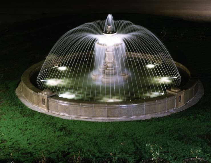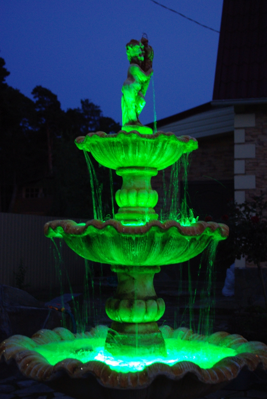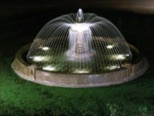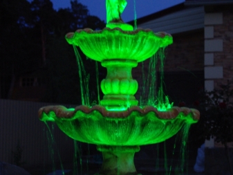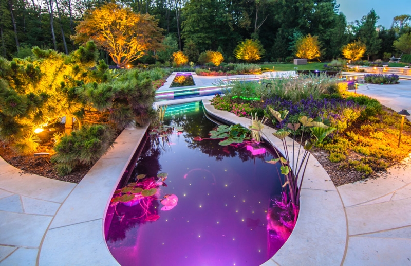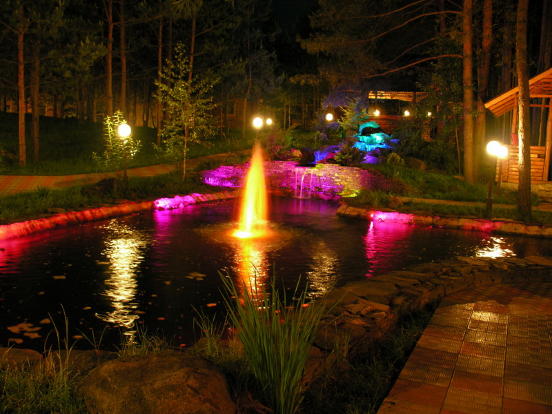 Un éclairage monochrome et multicolore est utilisé pour les plans d’eau: le choix de l’une ou l’autre option dépend du design général du jardin.