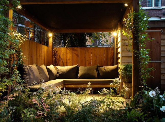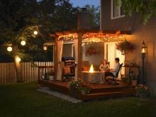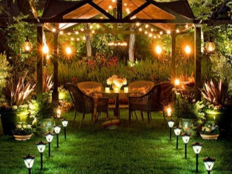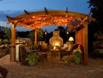 Pour les banlieues, il est logique d’organiser un lieu de rassemblement avec des amis ayant besoin d’un éclairage spécial. Pour que le «lieu de rencontre» soit le plus attrayant possible, il est recommandé de l’organiser sous un auvent surmonté d’une guirlande. Un tel éclairage inhabituel ajoutera un sens de la fête, prêt à faire des blagues amusantes et à danser le soir. Si vous choisissez une lumière en sourdine douce, vous pourrez créer une atmosphère de confiance propice aux conversations intimes.