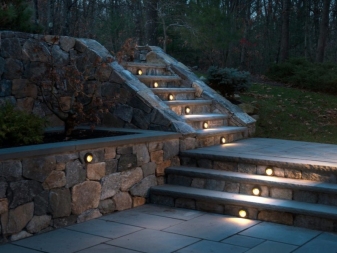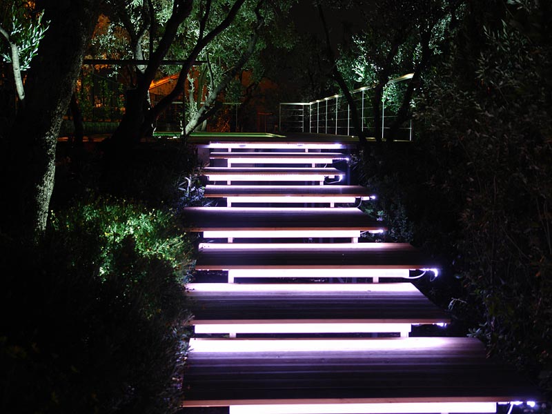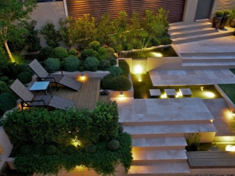 Si la conception du paysage prévoit des escaliers, rappelez-vous qu'ils nécessitent un éclairage différent de celui des pistes ordinaires. Il est nécessaire de souligner les étapes à suivre pour éviter les accidents lors du fonctionnement de la structure. Dans ce cas, les concepteurs ont une solution: régler le rétroéclairage directement sur le bord des marches. La lumière blanche brillante, comme dans ce cas, met en valeur l’espace environnant pas moins que les lampes le long du contour, mais semble plus moderne et futuriste.