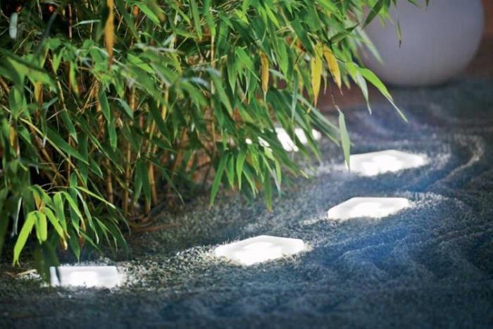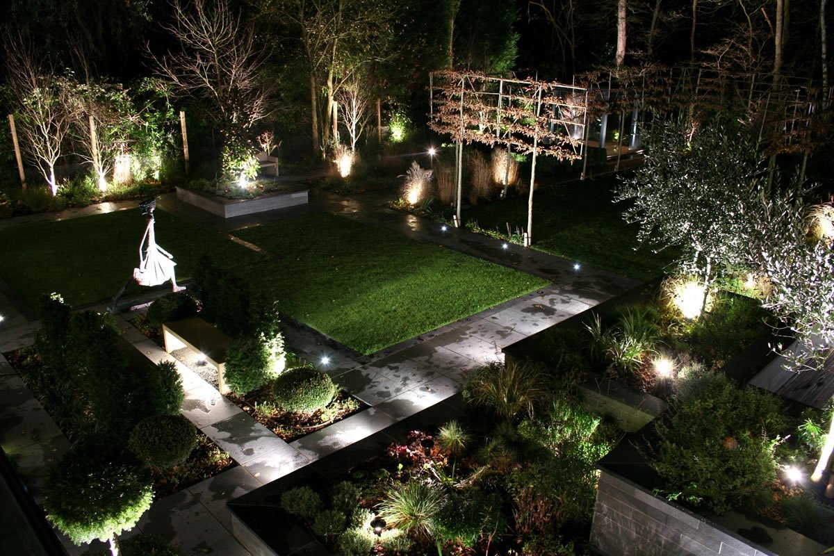 Pour les jardins de style moderne, il est typique d’utiliser une lumière blanche froide, car elle a l’air plus futuriste.À l'aide de la lumière blanche, vous pouvez placer des accents, montrant des objets intéressants tels qu'ils sont réellement, car c'est la lumière blanche qui se rapproche le plus de la lumière du jour. De plus, dans les zones modernes, pratiquement aucune autre source de lumière n’est utilisée, à l’exception de la lumière cachée. Comme prévu par les concepteurs, la lumière jaillit comme de la terre, donnant au jardin une atmosphère de mystère et de mystère.