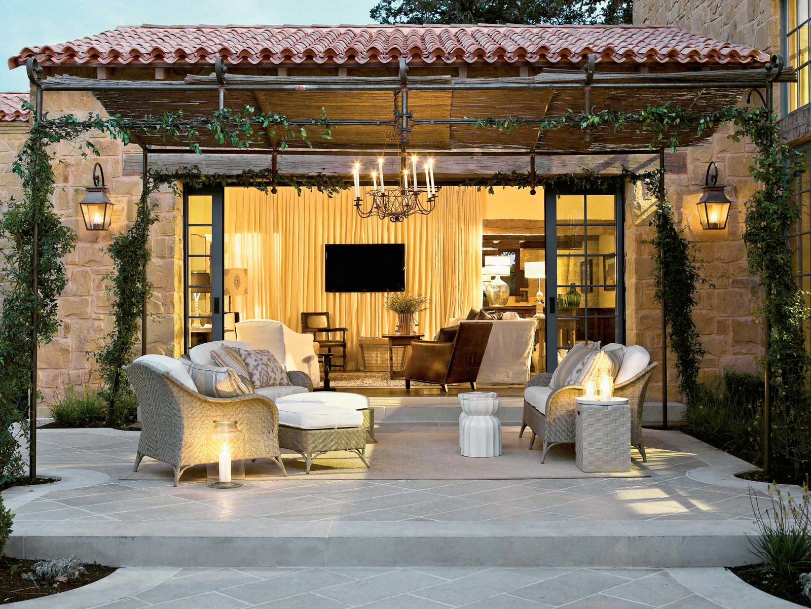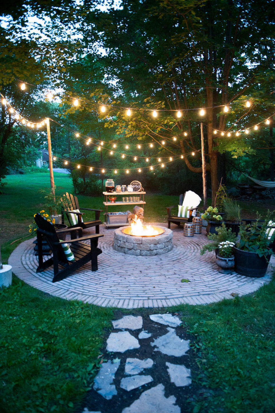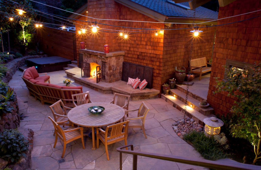 Placer des lampes d'extérieur sur des suspensions-cordons peut donner un aspect plus confortable à n'importe quel endroit. L’éclairage au-dessus de la terrasse pour les réunions amicales est donc propice à des conversations sincères en compagnie chaleureuse.Le choix de la couleur douce joue au profit de l’atmosphère entière, la rendant plus confortable et plus confiante. Si le concepteur choisissait une lumière d'une couleur différente, l'effet serait complètement différent.