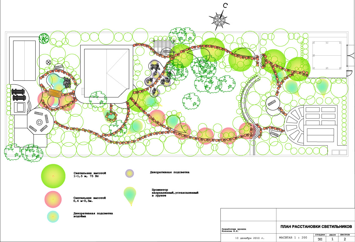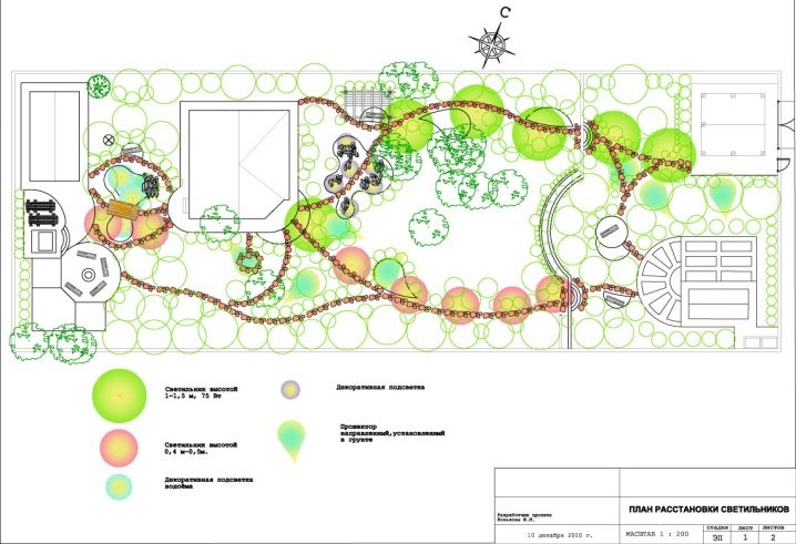 Après avoir déterminé le nombre exact de luminaires, il est nécessaire de tracer un schéma précis de leur emplacement.Pour ce faire, commencez par dessiner un plan de votre parcelle arrière et marquez-y l'emplacement de l'une ou l'autre lampe. N'oubliez pas de spécifier son type: intégré, décoratif, haut ou bas - chaque nuance est importante. Indiquez la puissance de chacune des lampes.