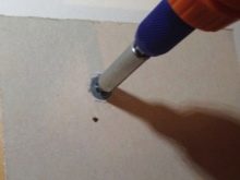 - Ensuite, le goujon est inséré dans le trou préparé. Il est nécessaire d'intégrer le goujon dans un matériau en feuille de plâtre comme une vis autotaraudeuse. Pour un tel travail, il est préférable d'utiliser un tournevis.