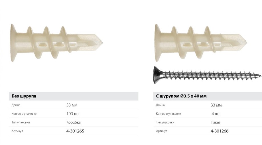 Ces produits sont un ensemble composé d’une cheville et d’un clou avec un filetage spécial. L'essentiel est de visser les bouchons. Vous ne pouvez pas les faire défilerPour cela, il est nécessaire de comparer les dimensions disponibles et de prendre en compte la complexité de l'installation.
