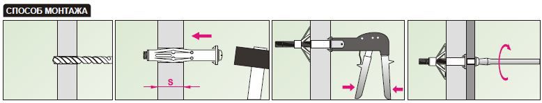 Ce type de goujon utilisé pour monter les panneaux de gypse peut être distingué par type de fabrication. Ce type de fixation est fabriqué selon le principe de l'extension du harpon afin d'obtenir une fixation suffisamment résistante.
